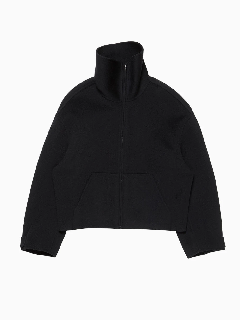 Acne Studios zip jacket. Crafted in black brushed cashmere-wool blend with a high neckline, two-way zip closure, front pockets and tab details at the cuffs. Featuring a relaxed fit and sleeves, and hip length.