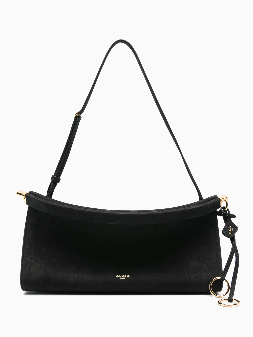 Alaïa Le Click East West curved bag in nubuck. Featuring hinge opening system wrapped with leather, signature folding detail on the bottom of the bag, decorative ties with metallic rings and shoulder or cross body carry thanks to an adjustable strap.