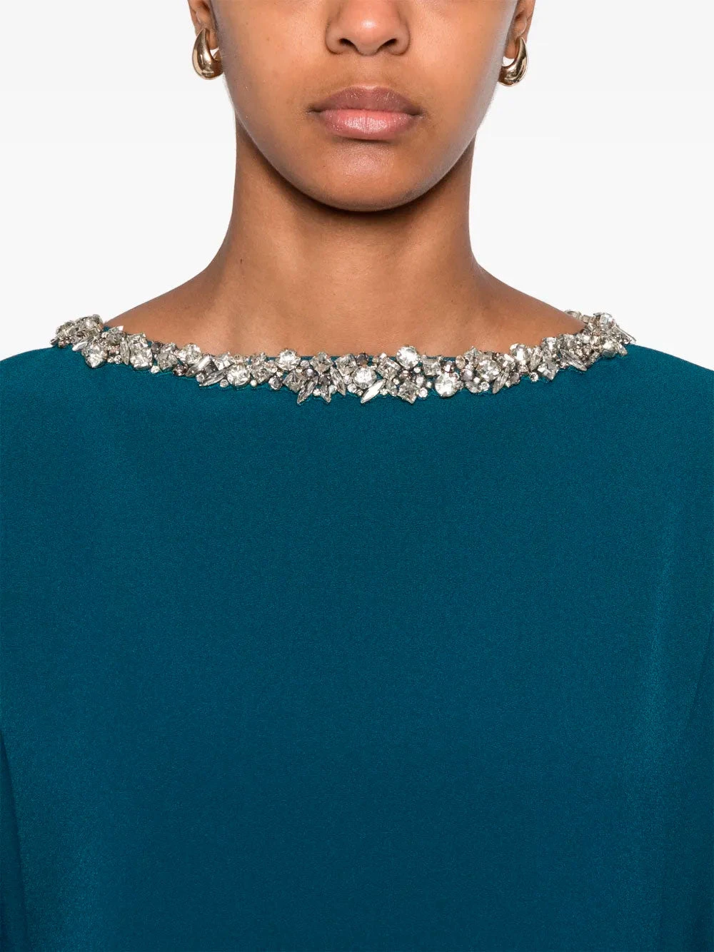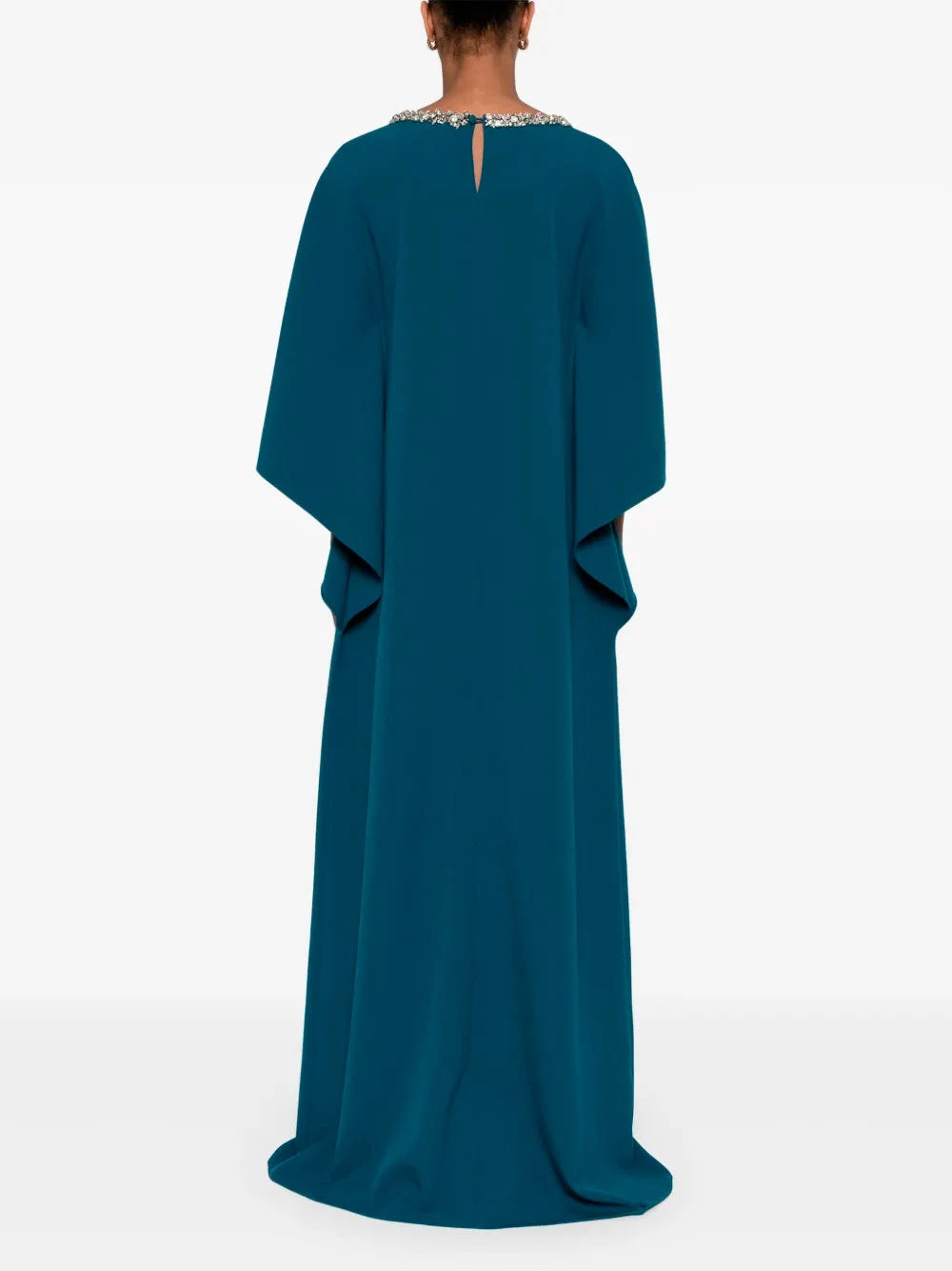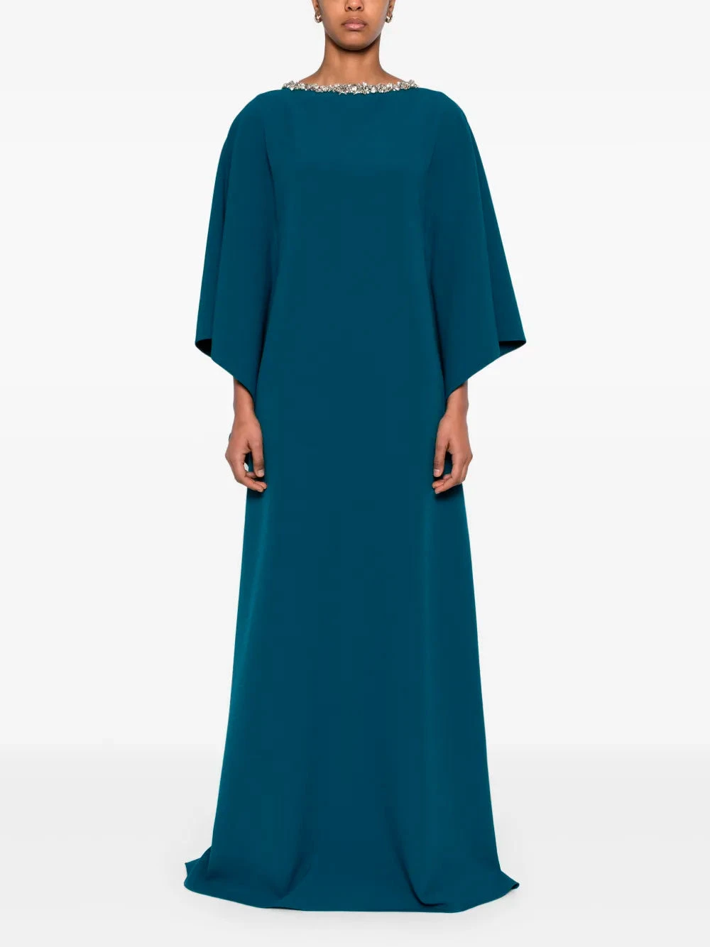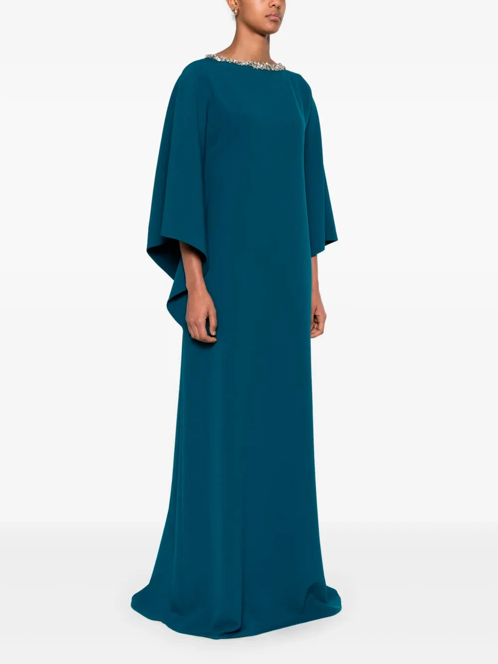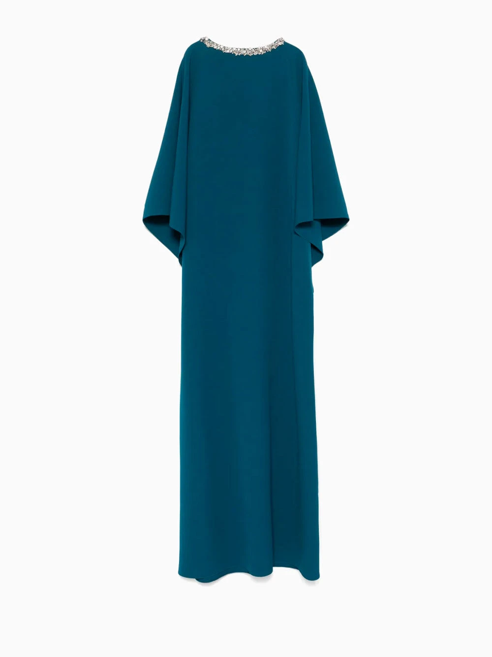 Safiyaa Amarella gown featuring teal blue, single rear button fastening, keyhole detail to the rear, crystal embellishment and dolman sleeves.