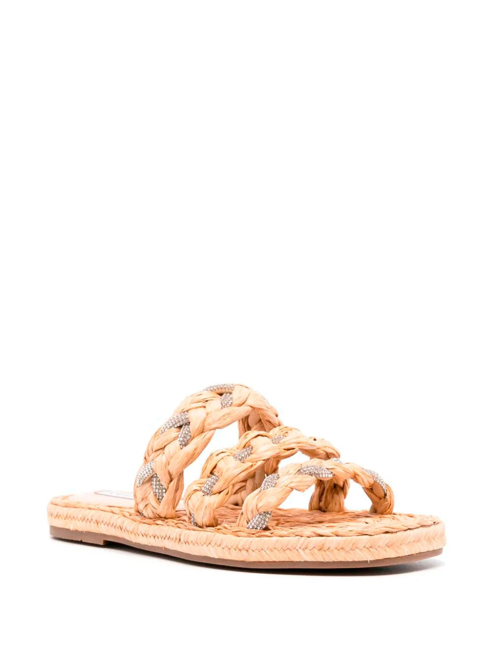 Aquazzura light sand raffia sandals. Crafted in a woven raffia design with crystal embellishment, round open toe and branded footbed. Boasting a braided raffia sole and a flat rubber sole.