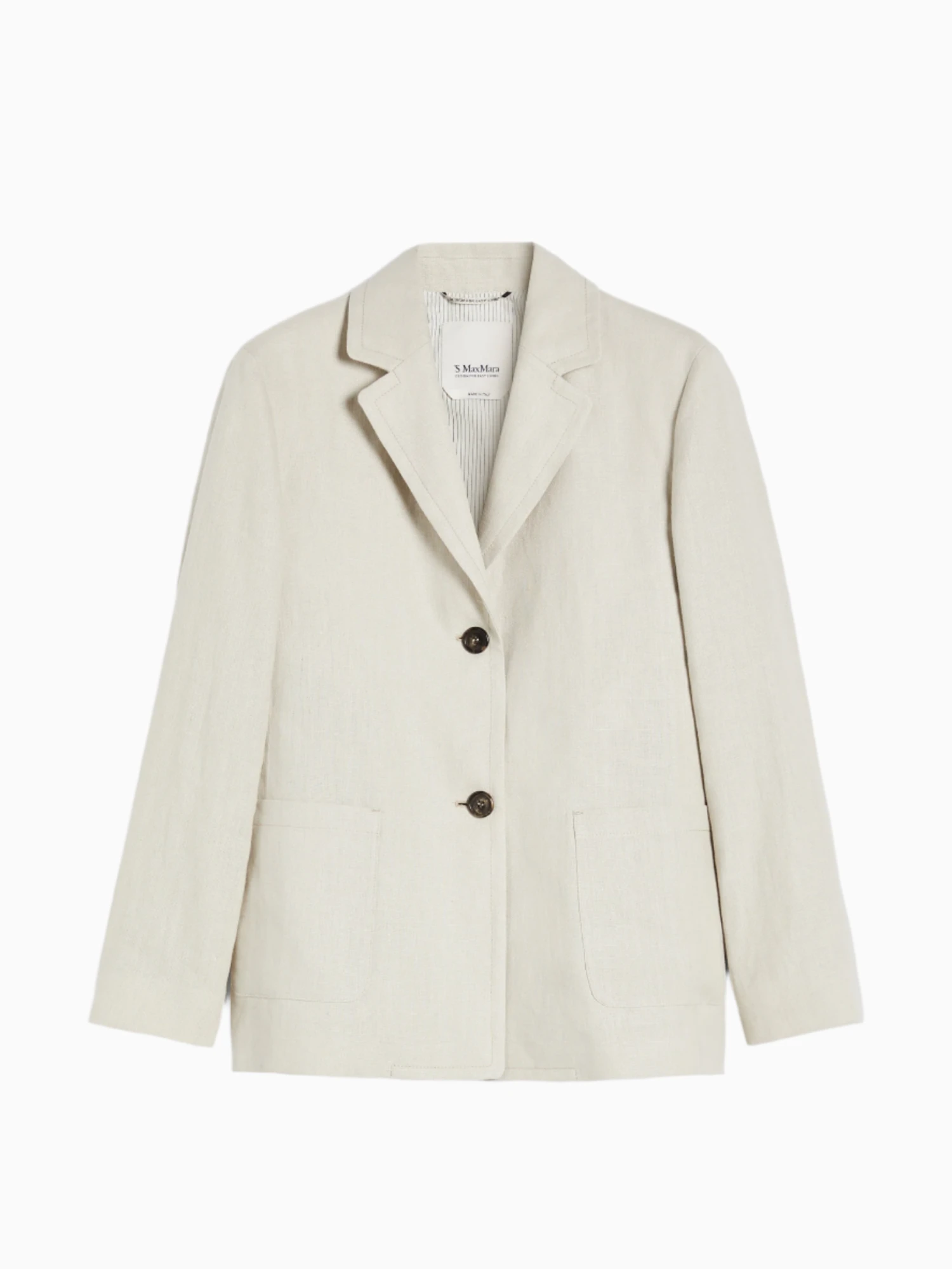 ‘S Max Mara single-breasted, straight-cut jacket made from heavy pure linen canvas in a sand-hue. Semi-lined style featuring a lapel collar, long set-in sleeves with a slit in the cuffs and front patch pockets. Features a centre back vent and visible two-button fastening.
