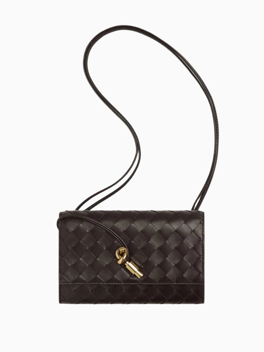 Bottega Veneta Andiamo pouch. Crafted in Intrecciato leather with one main compartment, two card slots and a sliding leather strap. Featuring a metallic knot closure, leather lining and brass-finish hardware.