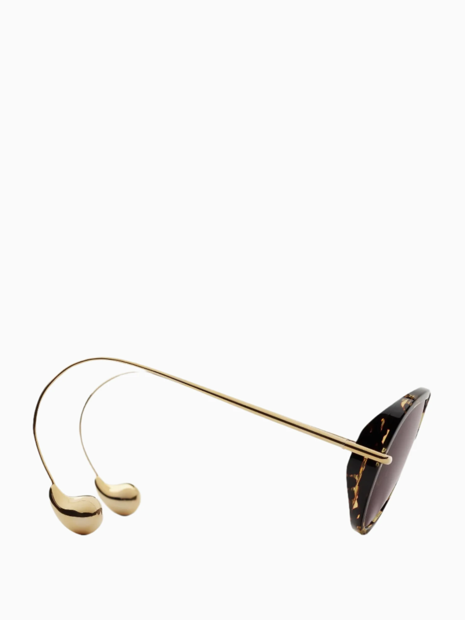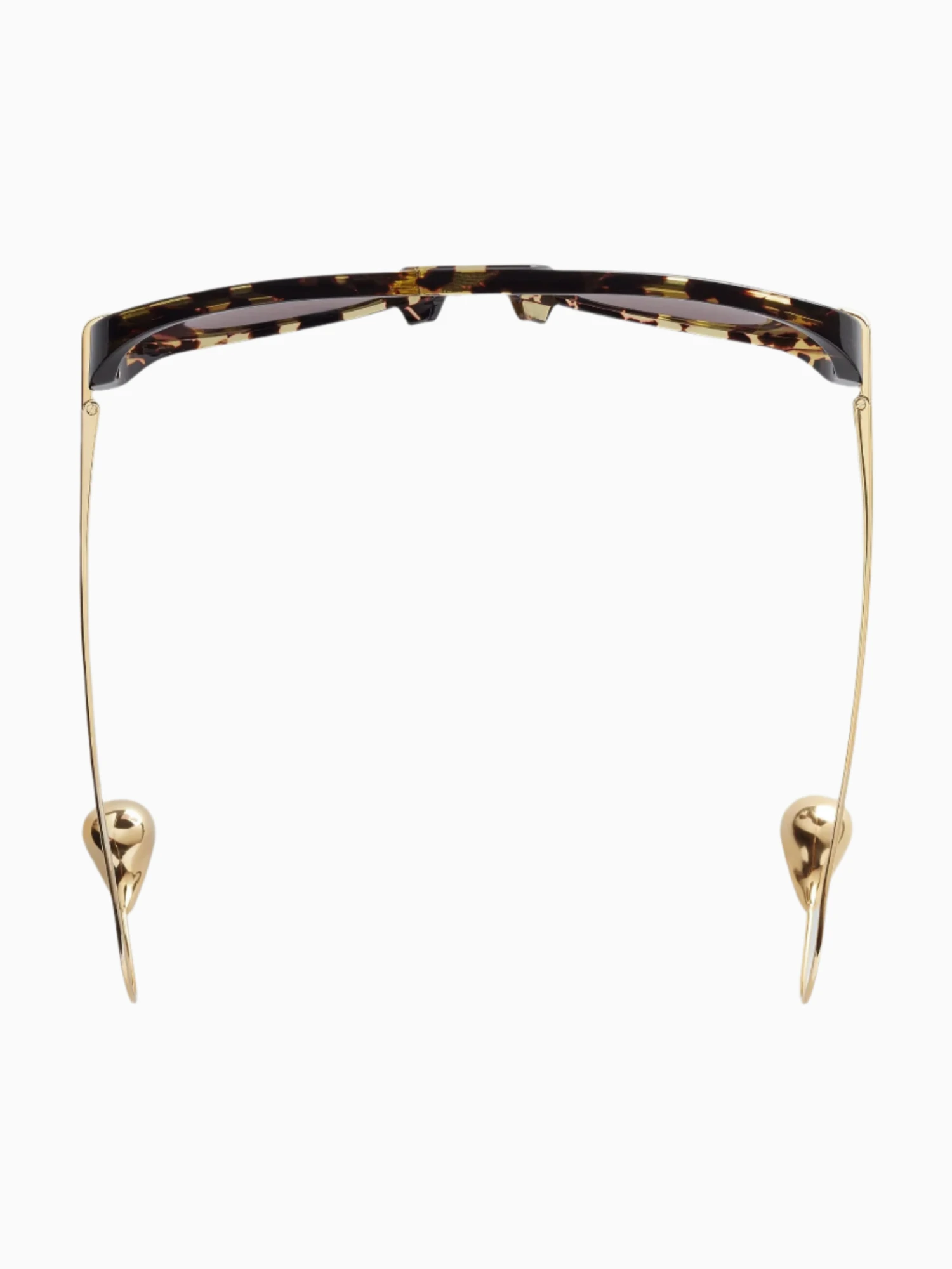 Bottega Veneta Drop Aviator sunglasses. Crafted in havana gold and grey with metal temples featuring the signature drop and bio nylon lenses.