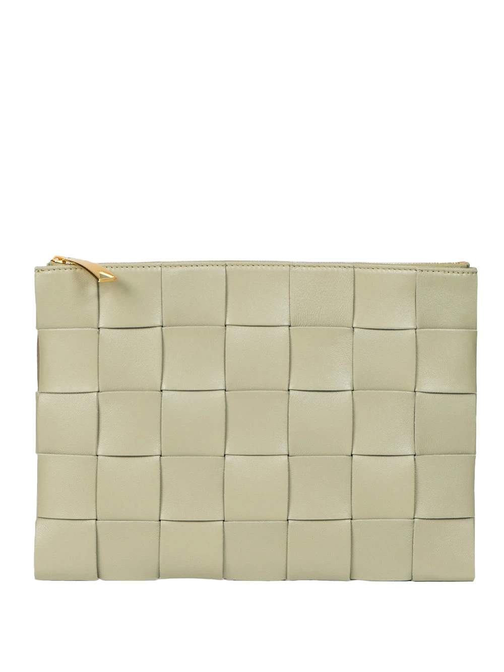 Bottega Veneta beige pouch featuring maxi intreccio leather and zip fatening.