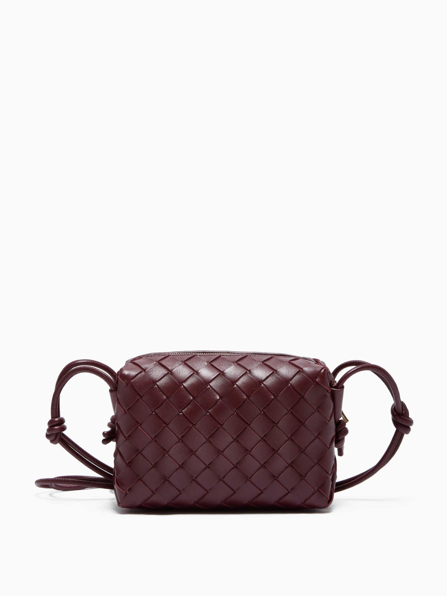 Bottega Veneta Mini Loop Camera bag. Crafted in burgundy Intrecciato leather with a cross-body design and a single compartment. Featuring zip closure and gold-tone hardware.