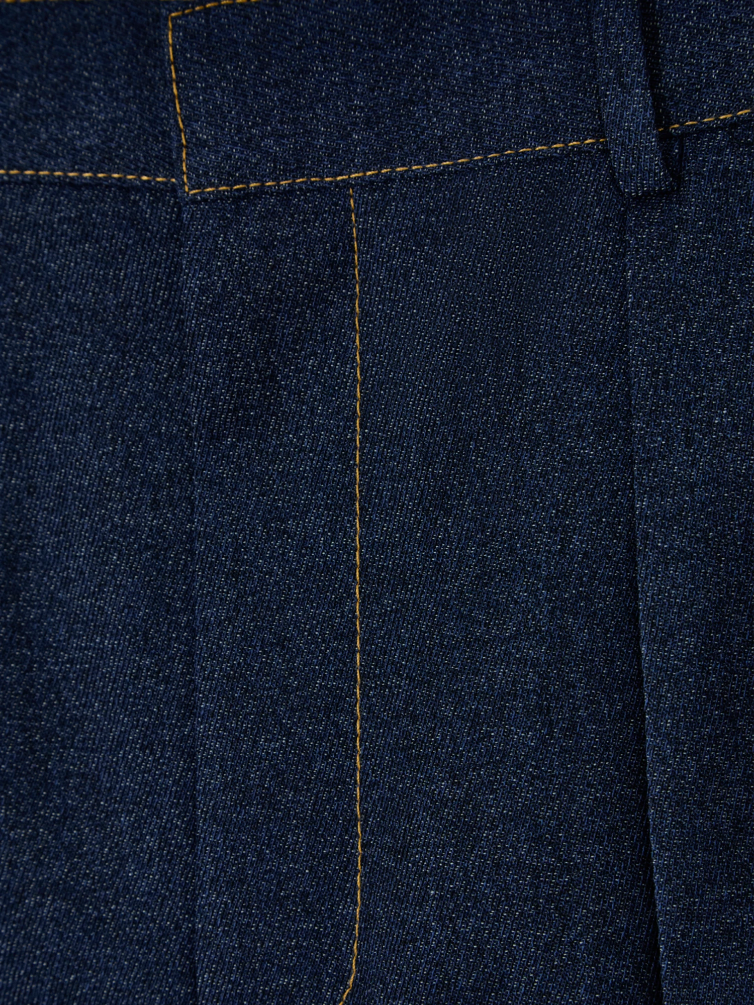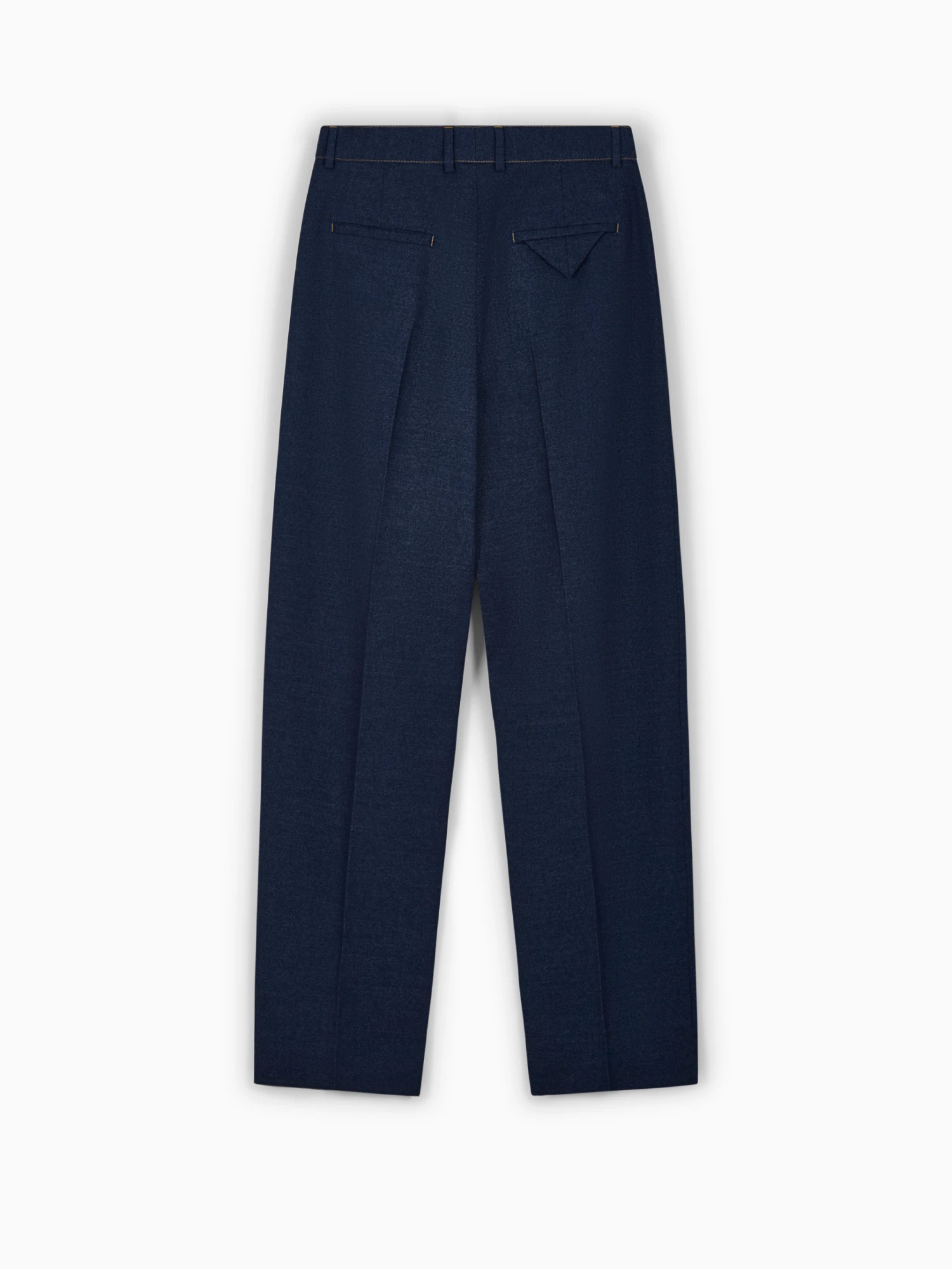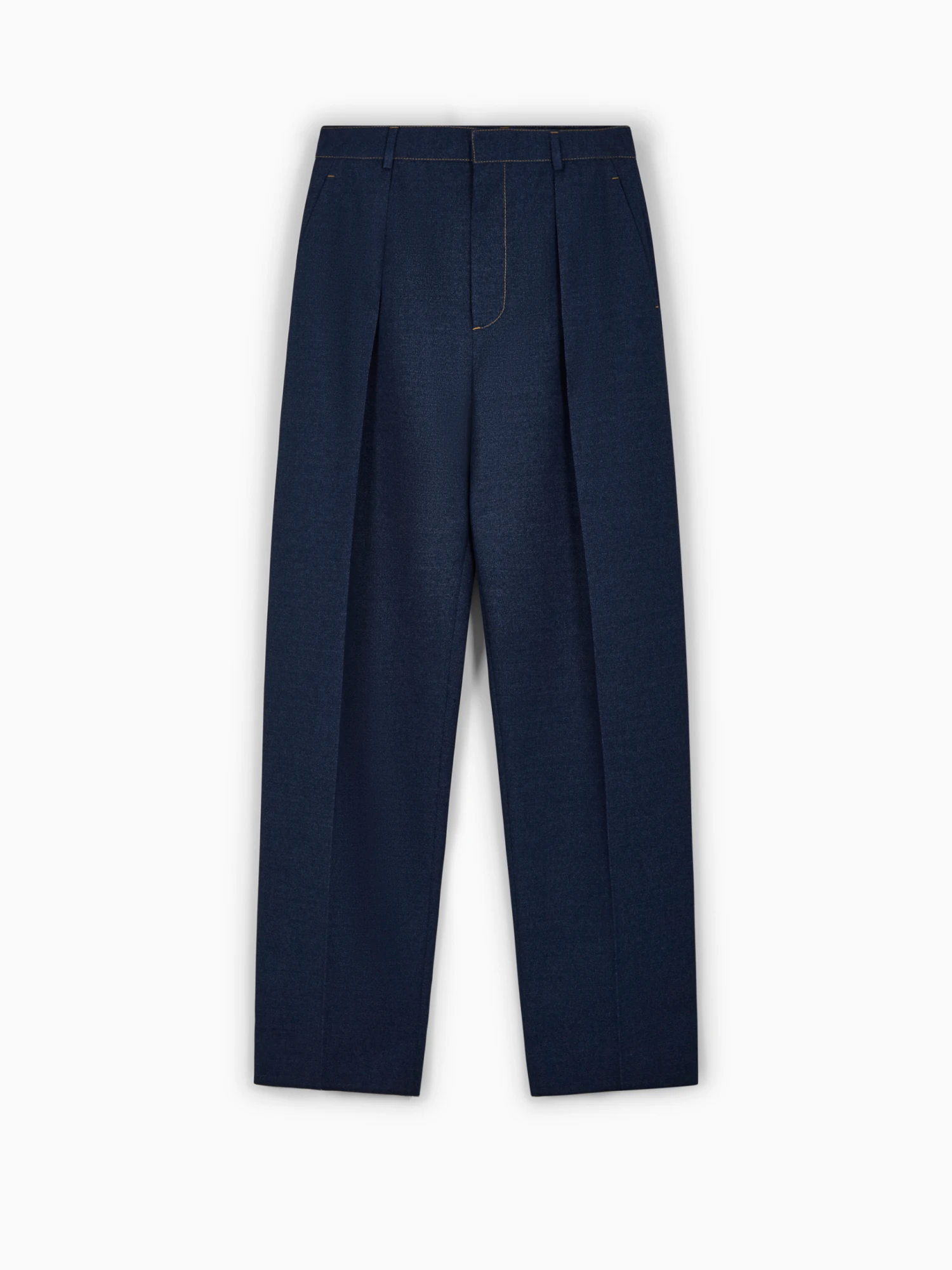 Bottega Veneta pleated trousers. Crafted in dark indigo wool with a straight cut, wide leg and a high waist with front pleats. Featuring contrasting stitching, fly pockets, side seams, back pockets and belt loops.
