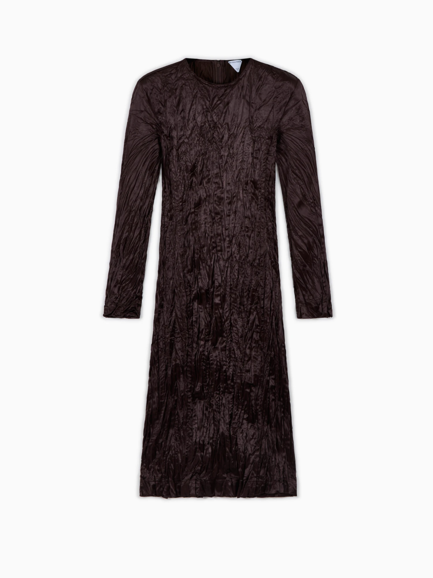 Bottega Veneta wrinkled-effect dress. Crafted in brown technical viscose satin with a box neck, long sleeves, all-over wrinkled effect and below-the-knee length.