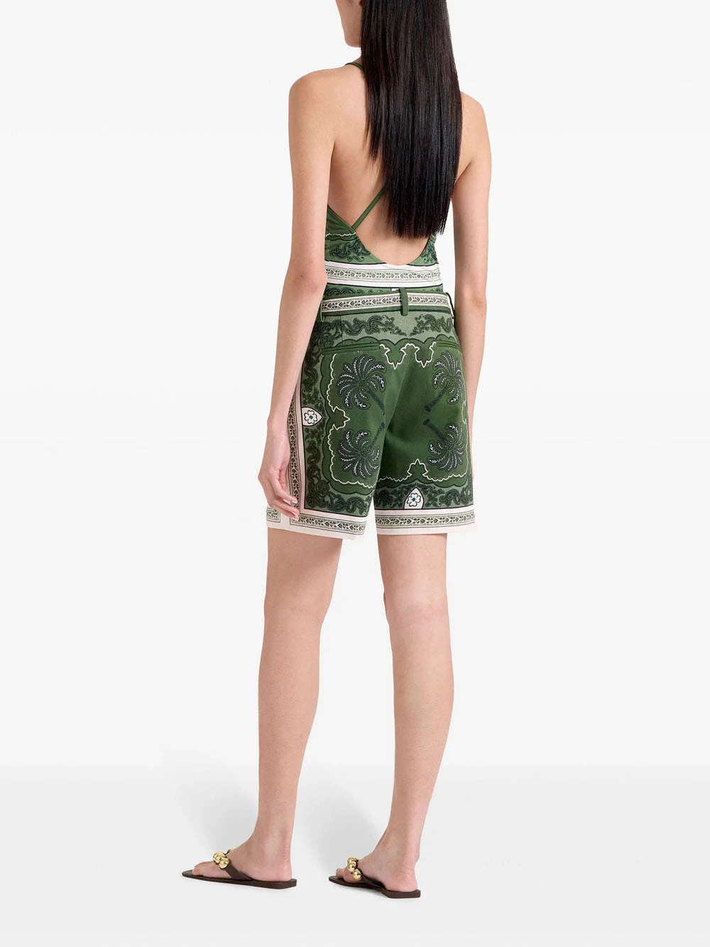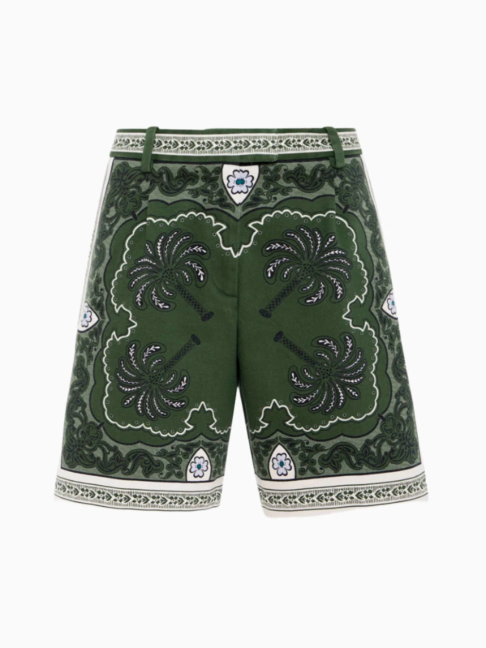 La DoubleJ printed shorts featuring Mirage green botanical pattern. Two side inset pockets and two rear jetted pockets. Concealed fly and button fastening. Belt loops.