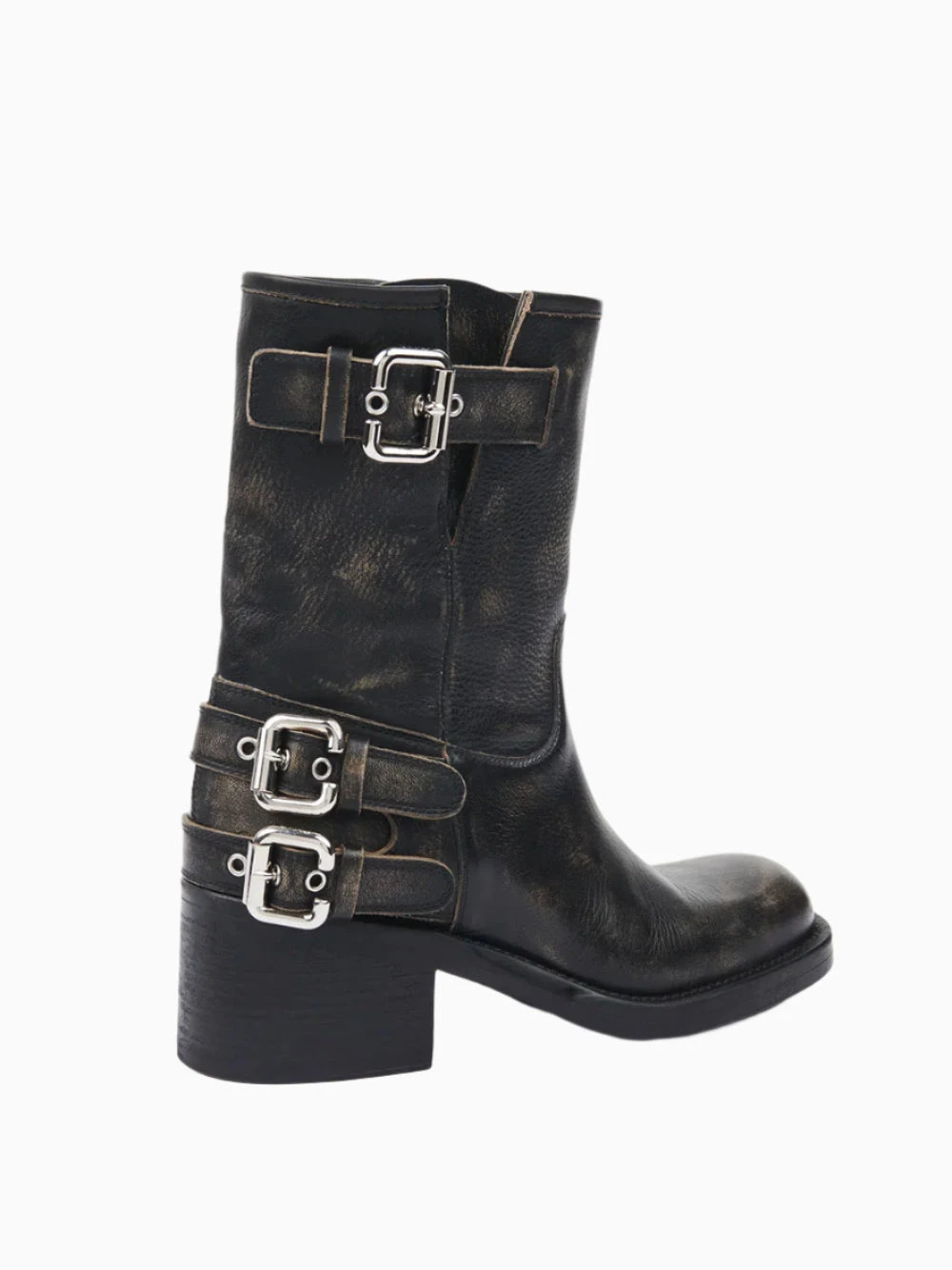 Chloé Dakota ankle boots. Crafted in black brushed leather with a biker design, rubber sole, low tube leg and a comfortable stacked heel. Featuring multiple silver-tone Paddington buckles and slip-on design.
