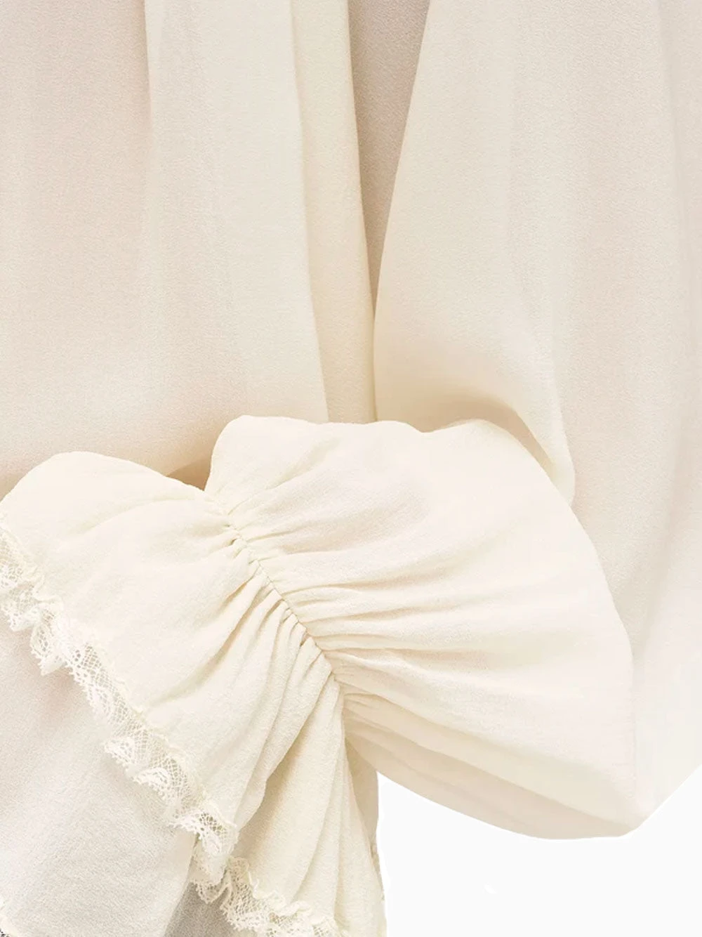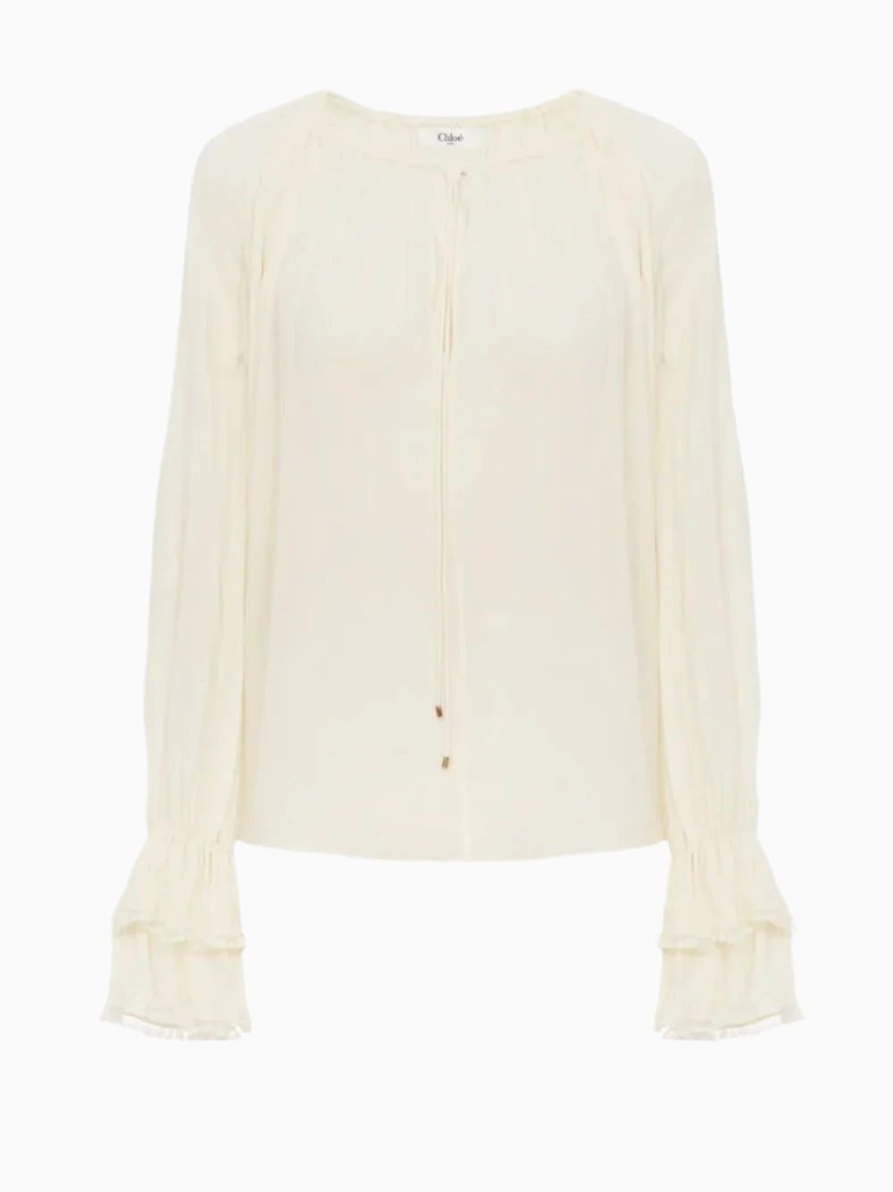 Chloé pristine white blouse. Crafted in organic silk georgette with a gathered design and a v-neckline. Featuring a drawstring collar with hammered metal ends and flared and lace trim cuffs.