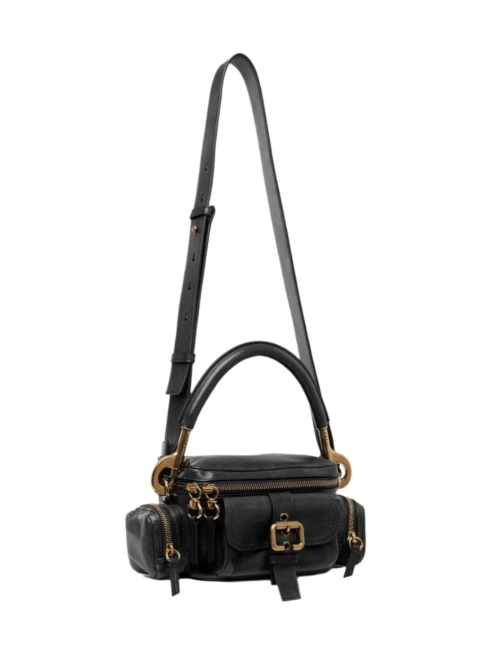 Chloé small double carry handbag. Crafted in black natural shiny leather with one main compartment, one inside flap pocket and two double side zip pockets. Featuring one front pocket with a magnetic flap closure, one removable handle, one adjustable and removable strap and zip closure.