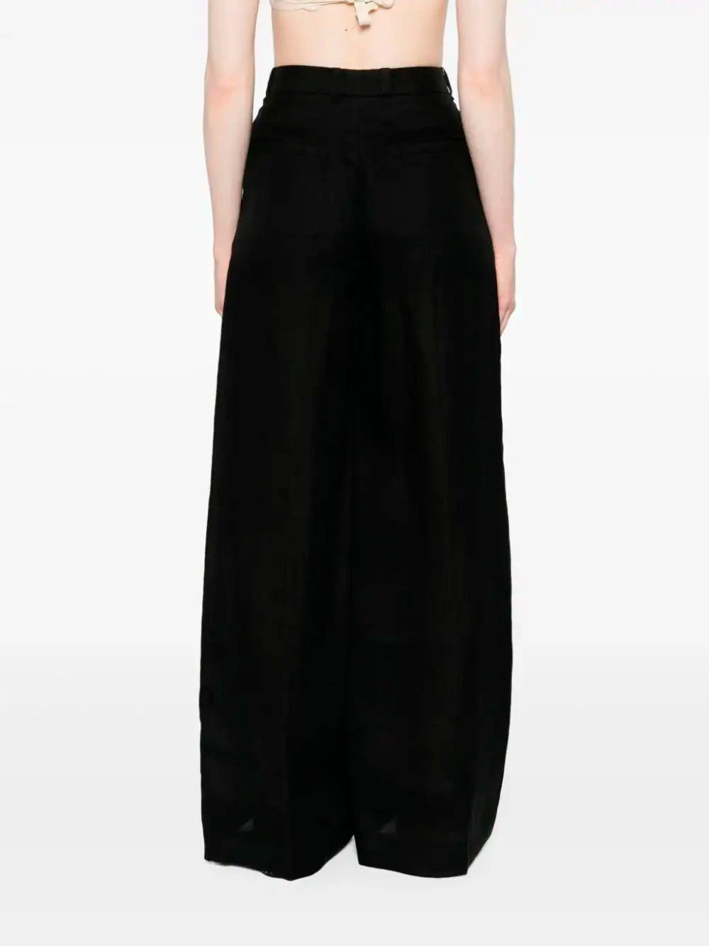 Chloé black ramie trousers. Crafted in voile with lightweight construction, a high waist, belt loops and two side slash pockets. Featuring pleat detailing to the front, full-length and two rear welt pockets. With partial lining, wide leg and concealed front button, hook and zip fastening.