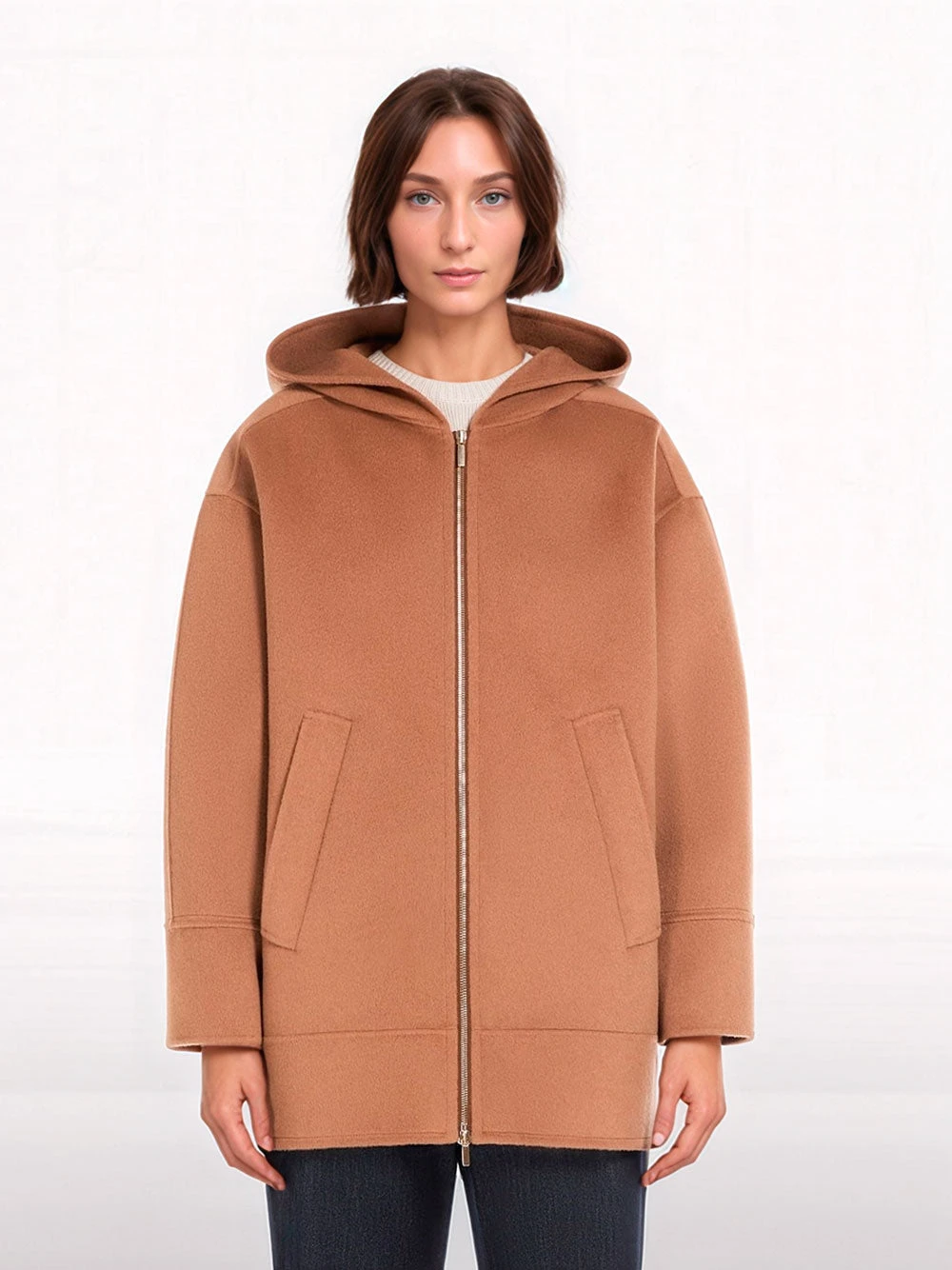 ‘S Max Mara camel hoodie in fine hand-sewn double-faced pure wool broadcloth. The oversized model boasts long low set-in sleeves and welt side pockets. Deep hem and cuff trims. Visible zip fastening on the front.