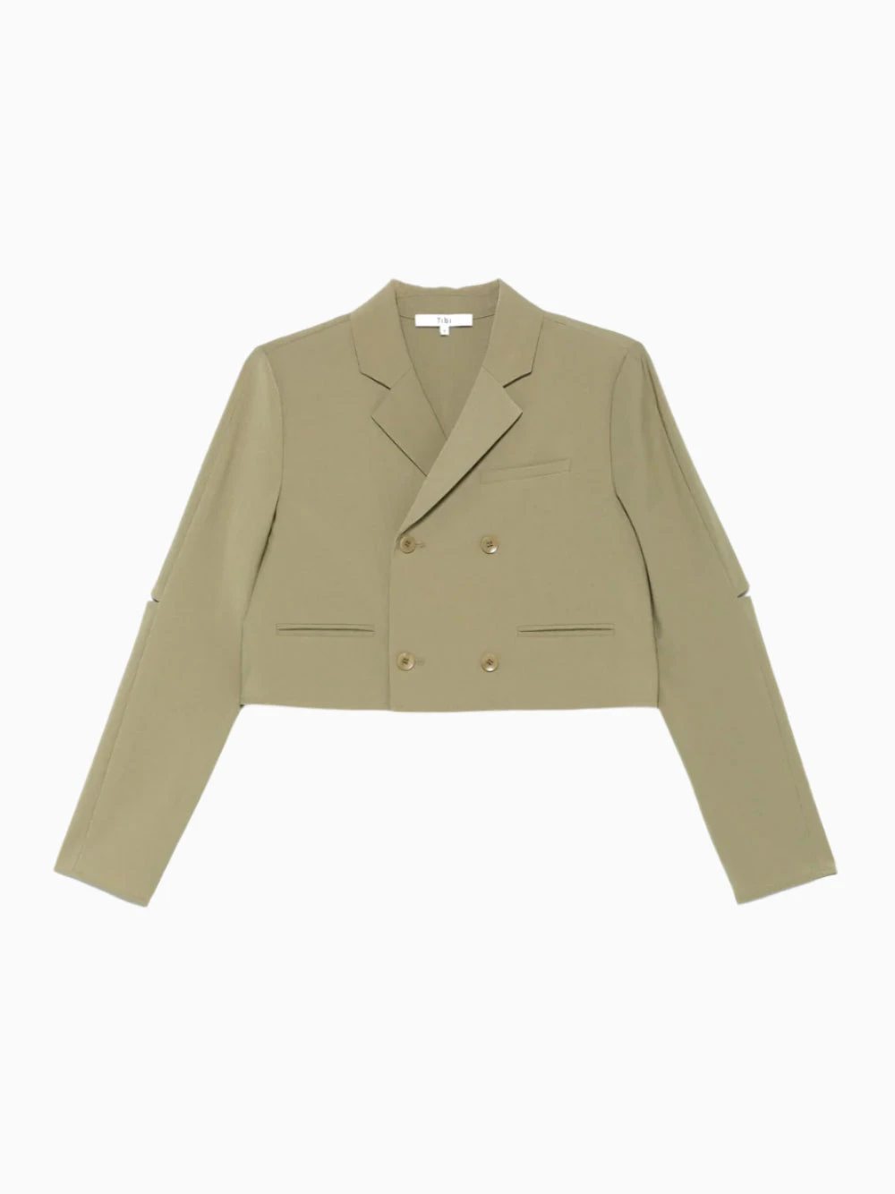 Tibi cropped jacket in in artichoke green tropical wool. Featuring long slit sleeves and two front jetted pockets. Double-breasted button fastening and chest welt pocket.