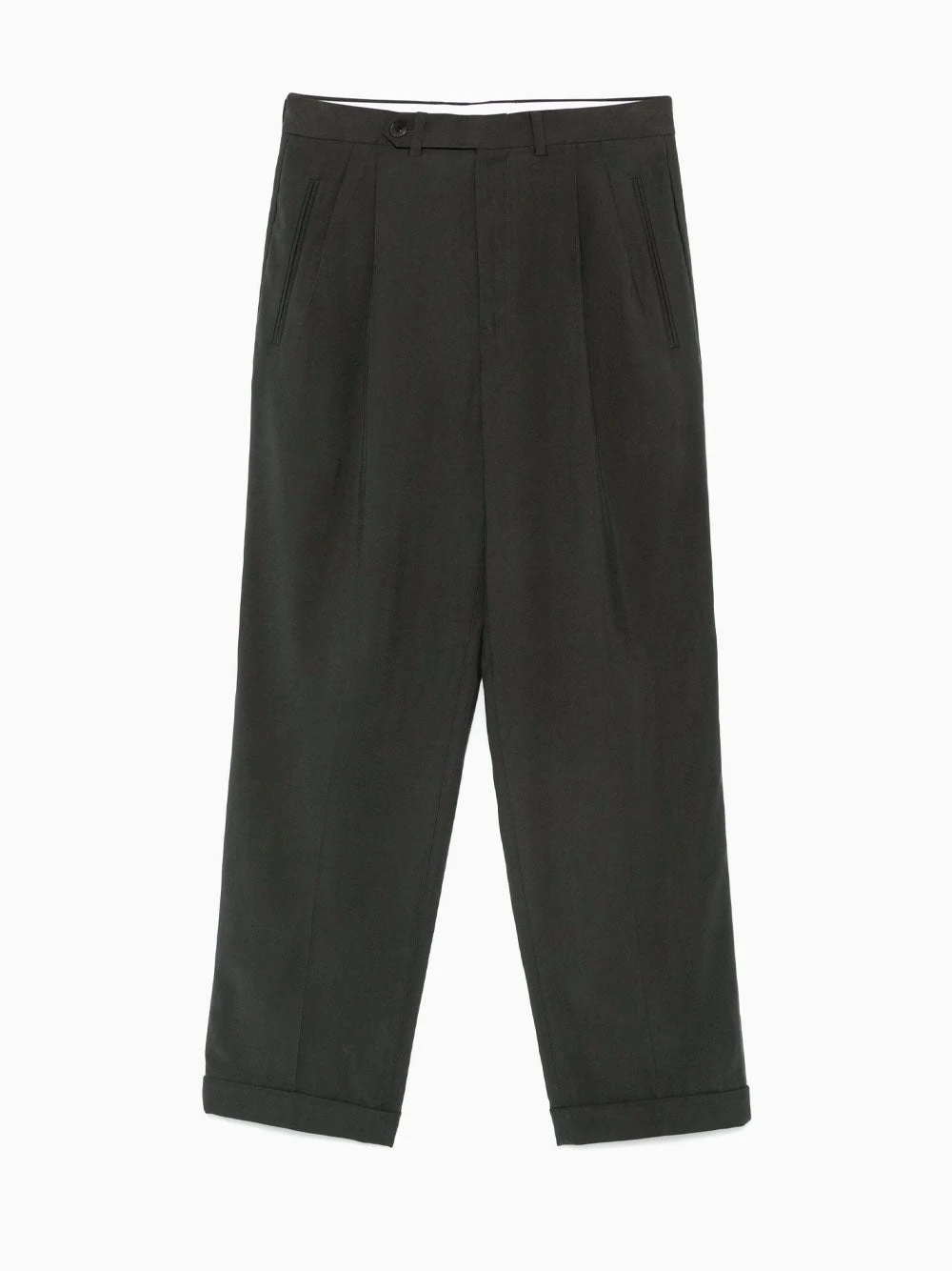 Tibi Derrick trousers featuring battleship grey, twill weave, concealed fly and button fastening, belt loops, two front jetted pockets, pleat detailing, two rear, jetted pockets, tailored design, turn-up hem.
