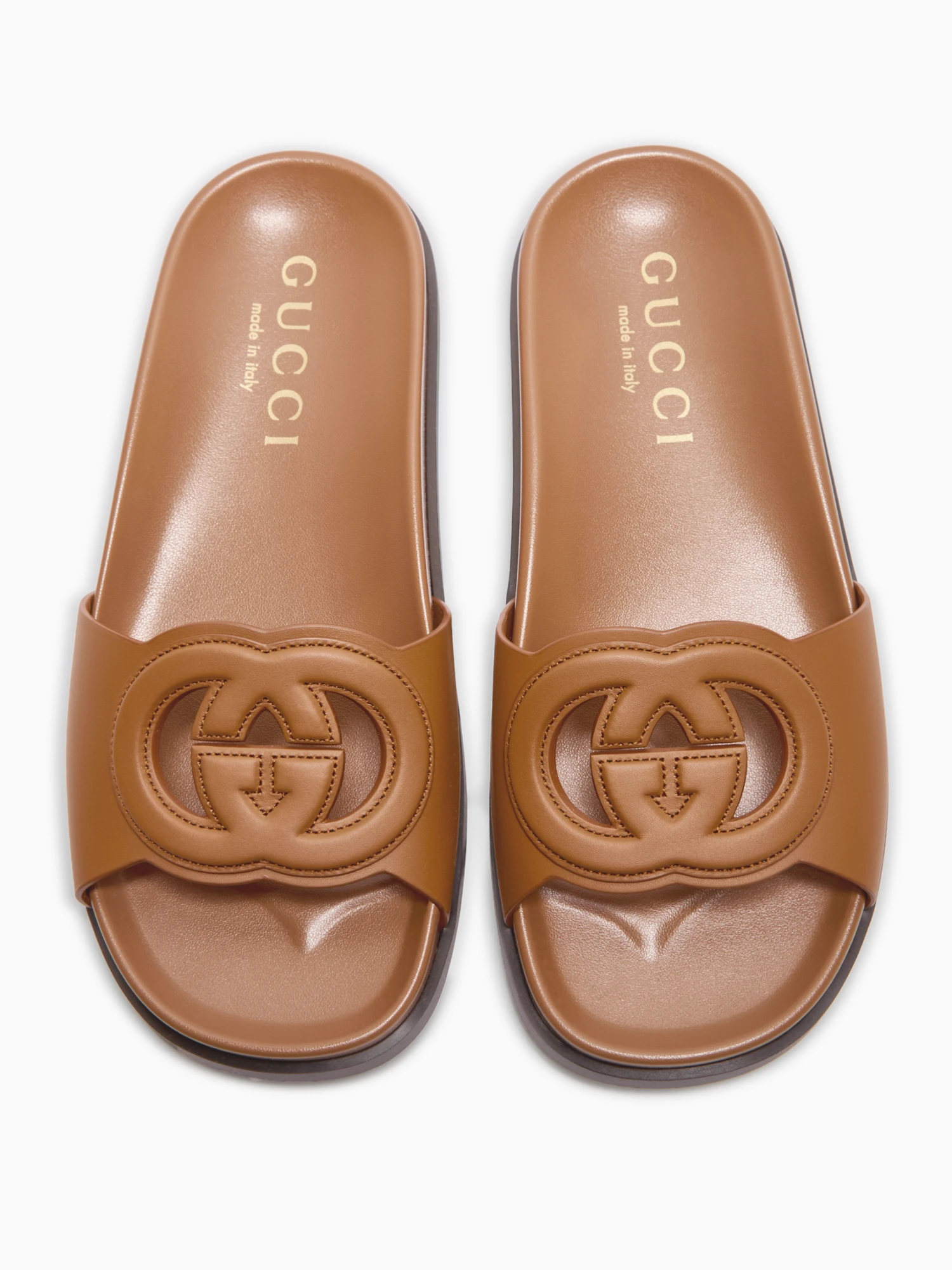 Gucci Cut sandals. Crafted in brown leather with a n ergonomic sole with black bottom.