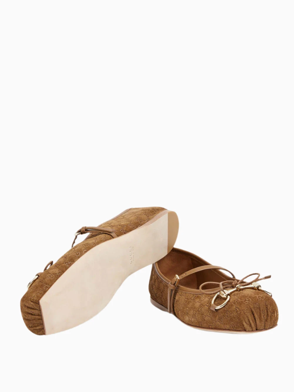 Gucci Horsebit ballet flat defined by a squared tucked toe cap and a delicate bow detail. This style is crafted in light brown mini GG suede and defined by a light gold-toned Horsebit. The “sacchetto” construction ensures a high level of comfort, thanks also to the soft padded insole. Leather lining and leather sole. Leather strap closure with adjustable buckle.