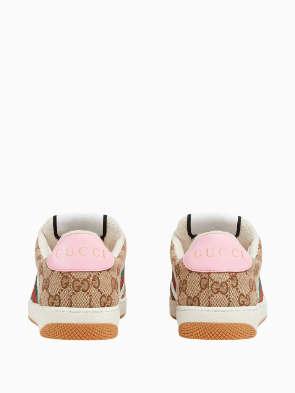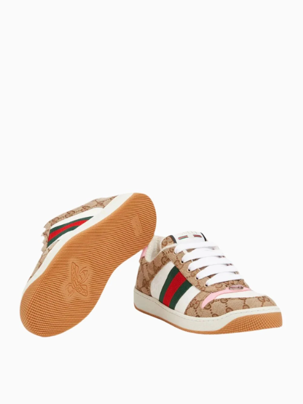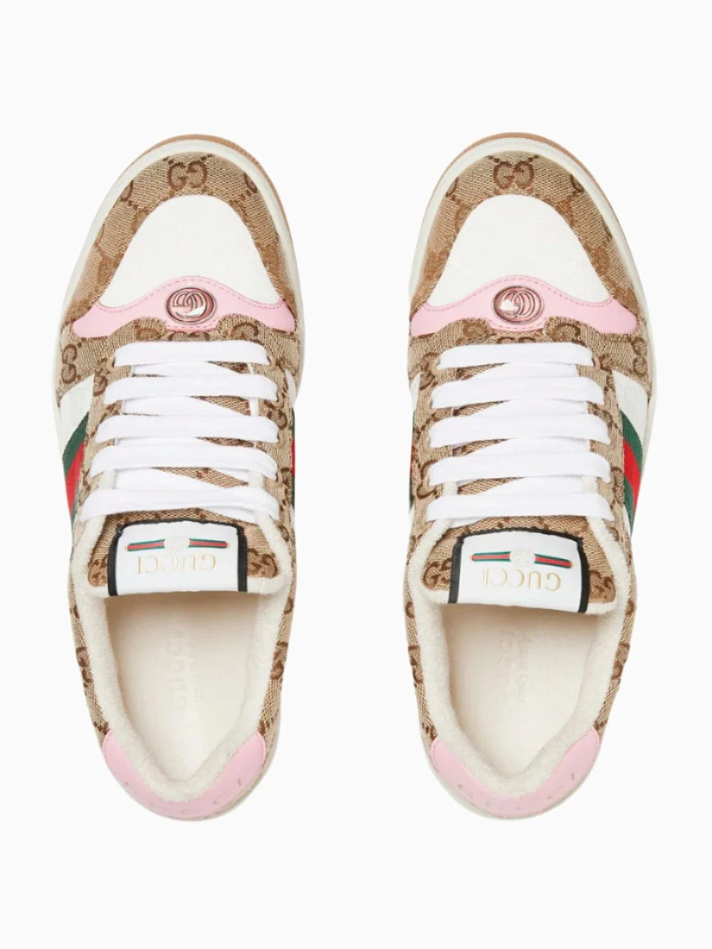 This variation of Gucci’s sneakers, influenced by classic trainers from the 1970s, are crafted in beige and dark brown Original GG canvas with a pink leather trim and Green and red Web stripe on the side. Featuring oval enameled detail with metal Double G, label with Gucci vintage logo, lace-up closure and a low heel. Additional pair of laces included, fabric lining.