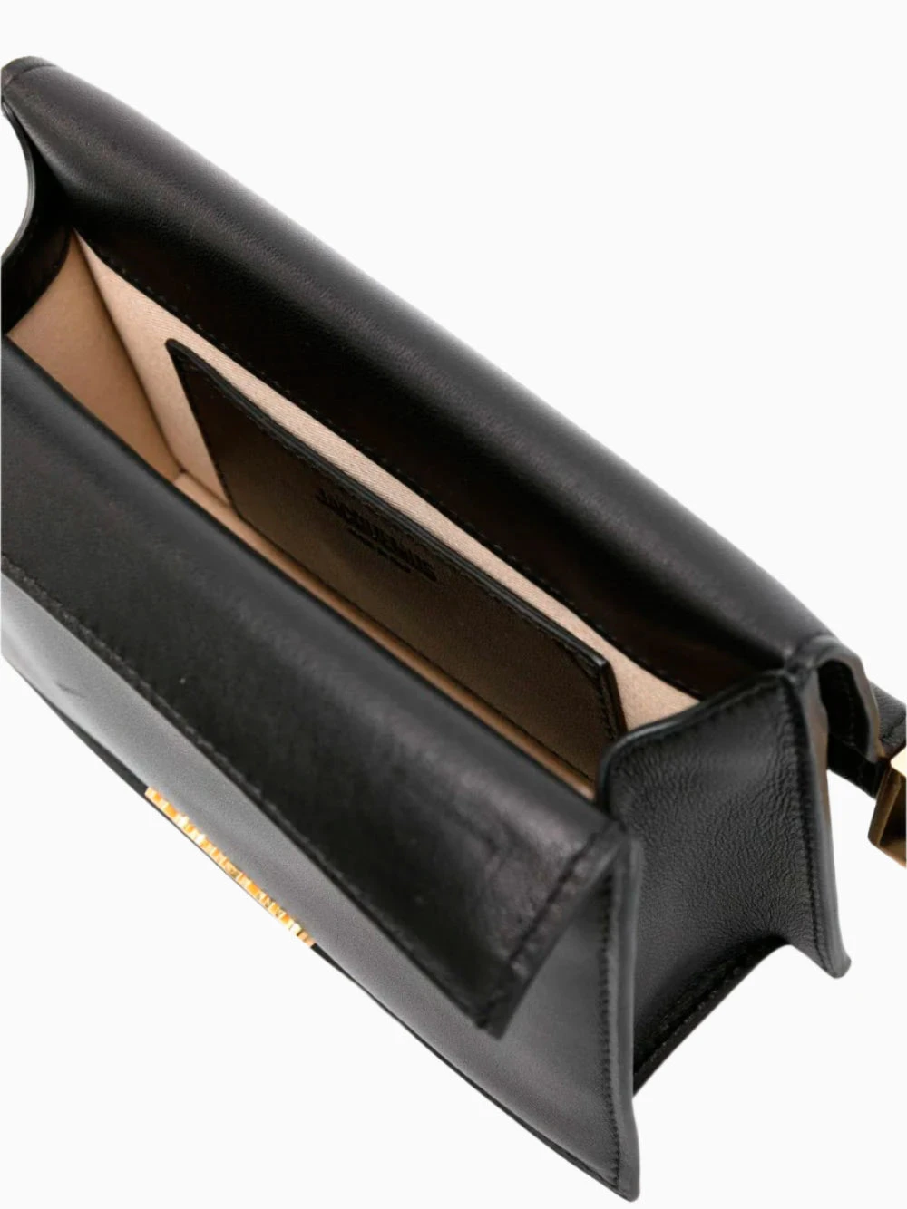 Jacquemus bag crafted in black leather, lunchbag shape and smooth grain. Featuring gold-tone logo lettering, foldover top with magnetic fastening and detachable chain-link shoulder strap. Rear magnetic-fastening pocket, main compartment and internal card slot. With full lining and silver-tone and gold-tone hardware. This piece comes complete with a protective dust bag.