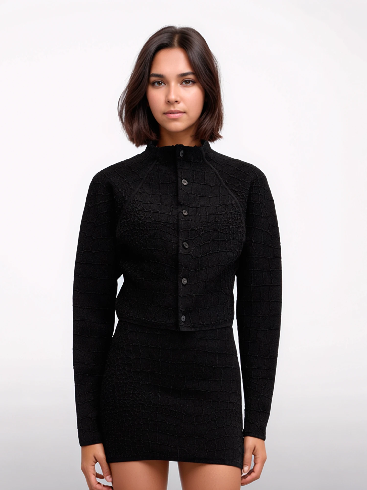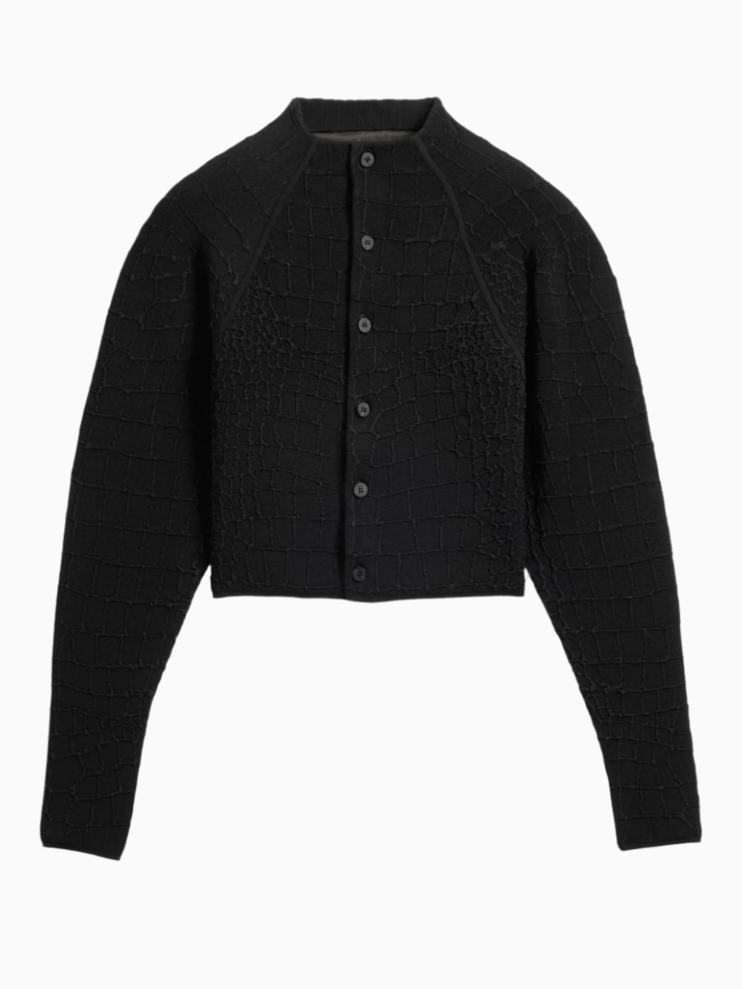 Jacquemus black Scala cardigan. Crafted in a straight fit with a crocodile embossed stretch viscose and an integrated stand collar. Featuring raglan sleeves, ribbed collar, cuffs and hem and “J” locker loop.