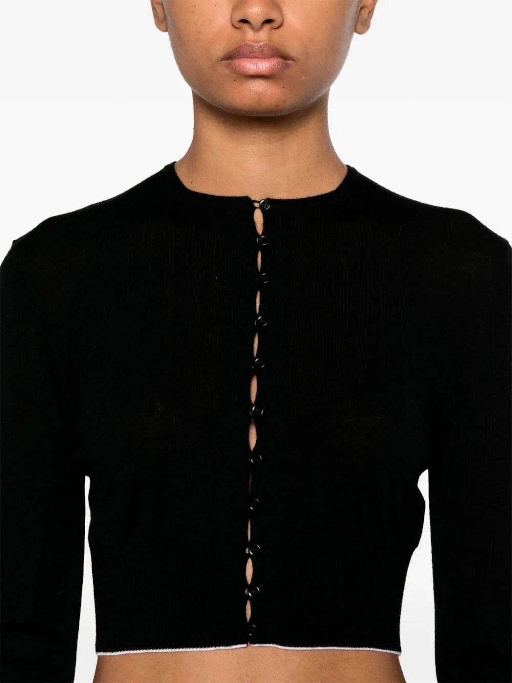 Jacquemus cardigan featuring black, virgin wool blend, fine knit, front button fastening, crew neck, long sleeves, ribbed cuffs, logo patch to the rear, ribbed hem.