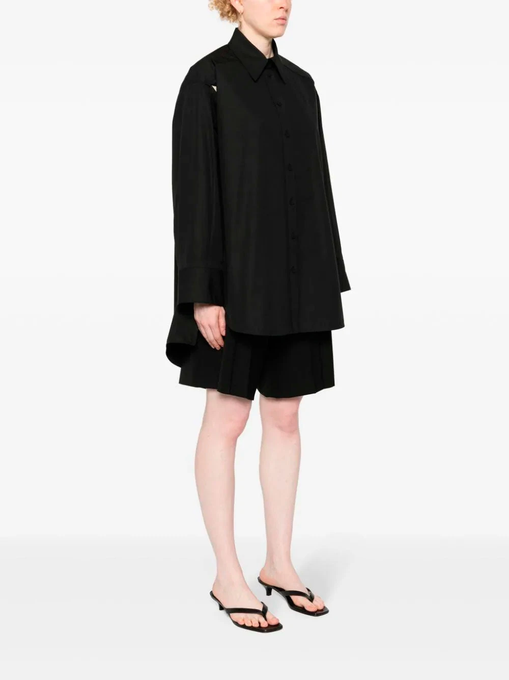 Jil Sander black cotton shirt. Crafted with a poplin texture, pointed flat collar, cut-out detailing to the sleeve and long sleeves with buttoned cuffs. Featuring fabric-covered buttons, high-low hem and front button placket.
