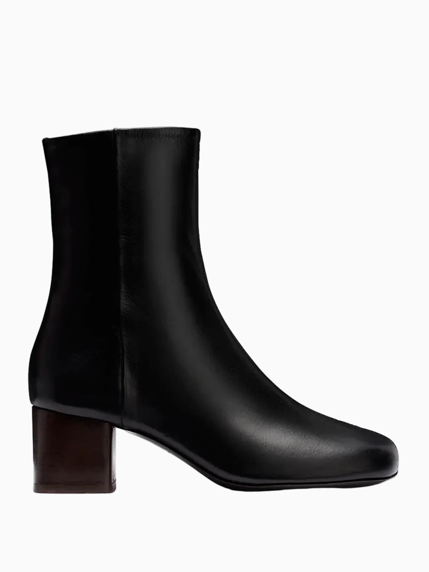 Lemaire Anatomic boots 55. Crafted in black glossy vegetable-tanned leather with a round toe and side zipper closure with a leather pull tab. Featuring a leather block heel and leather outsole, insole and lining.
