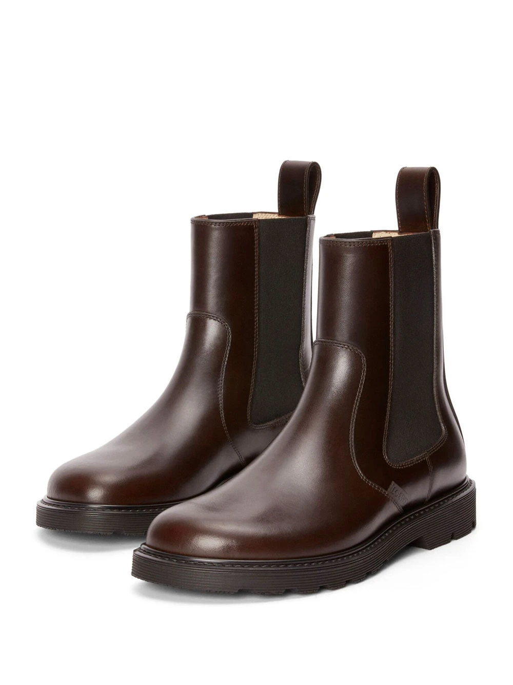 Loewe dark brown leather boots. Classic chelsea boot upper crafted in pull-up leather, featuring a rounded toe shape and a chunky rubber outsole. Featuring LOEWE label placed at the side.