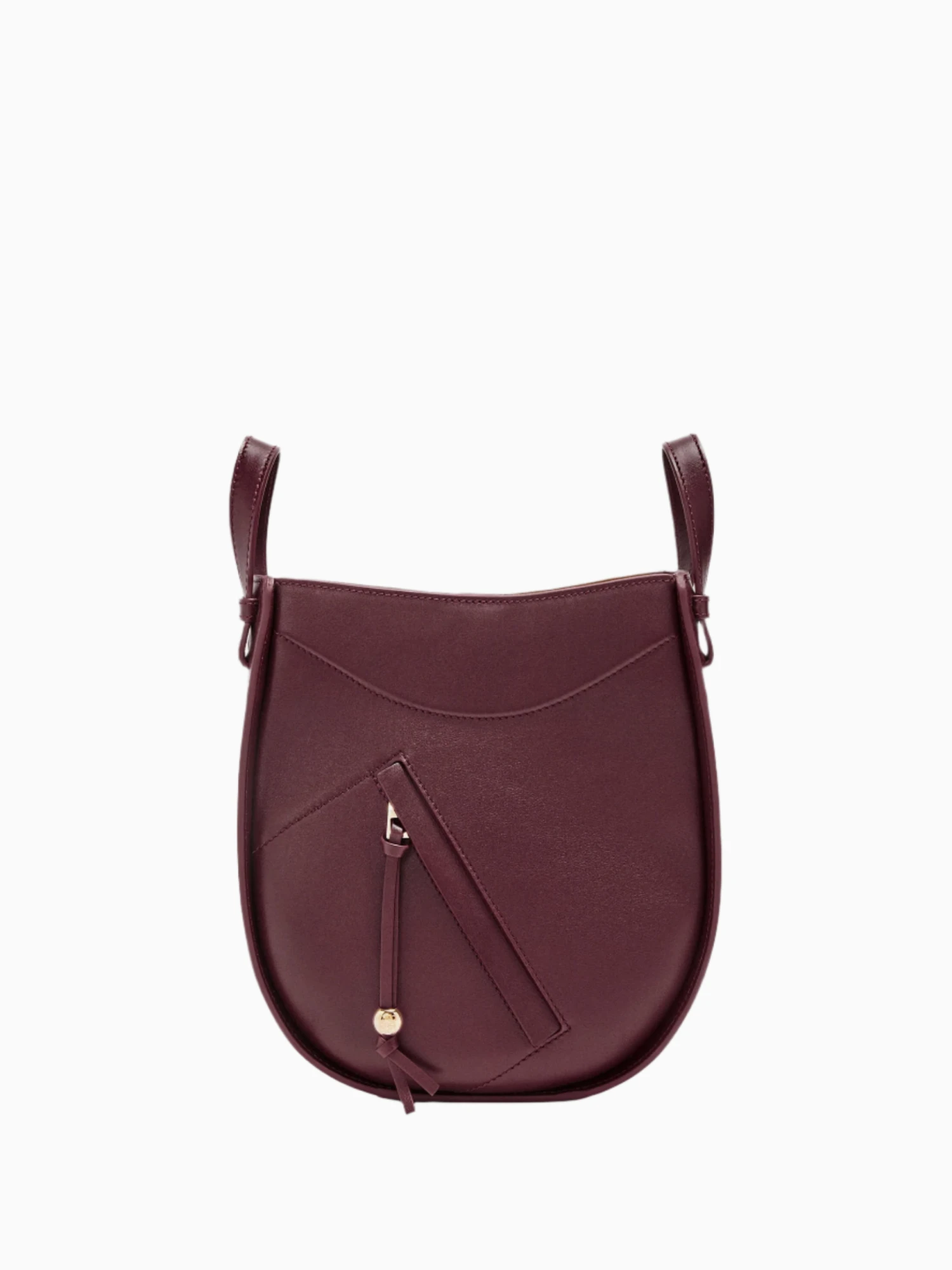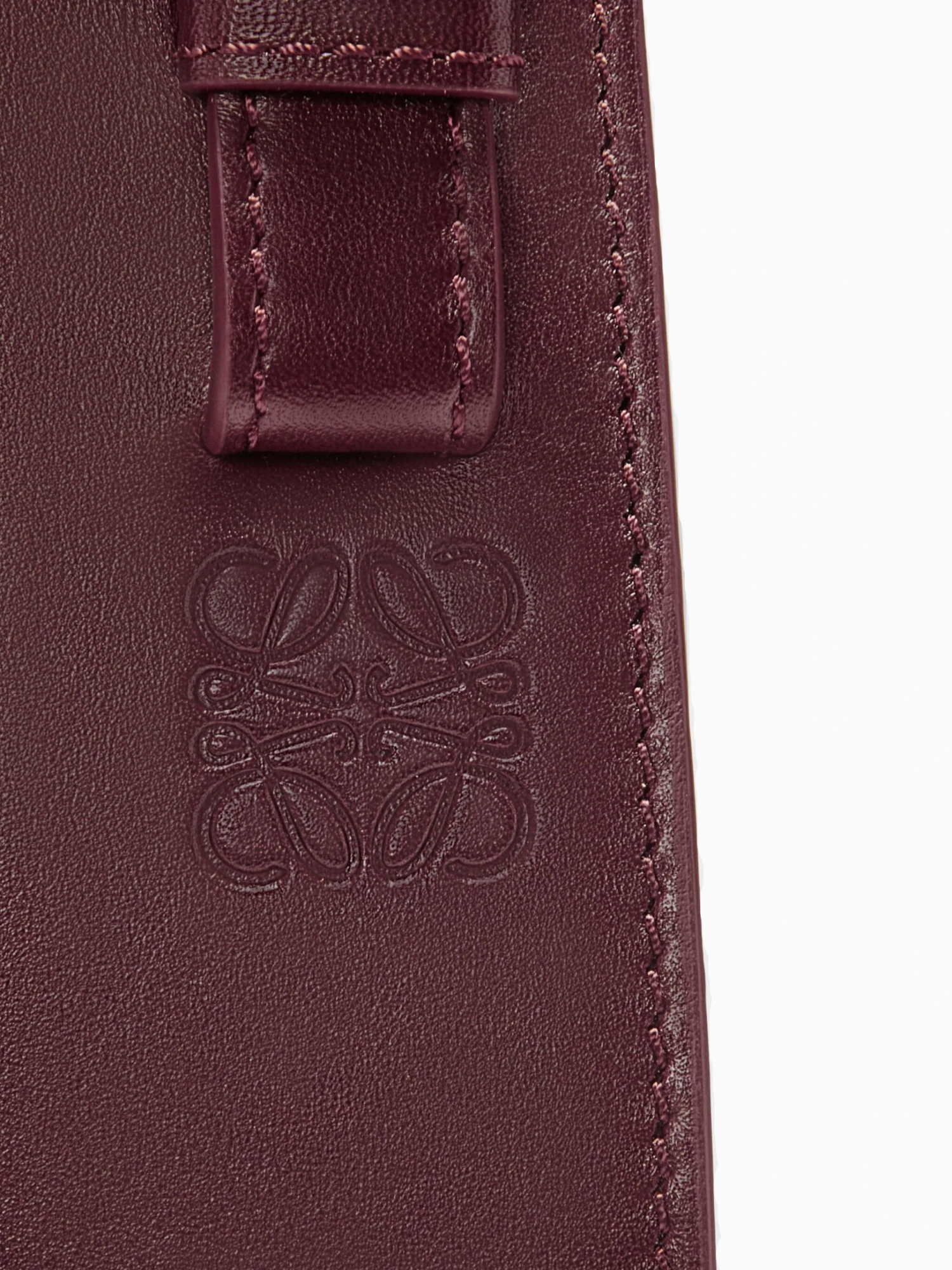 Loewe Hammock Slice bag. Crafted in brgundy shiny leather with an adjustable strap, magnetic closure, and bonded suede lining. Featuring one external zip pocket, one internal slip pocket, Anagram Pebble dice, embossed Anagram and embossed LOEWE inside.