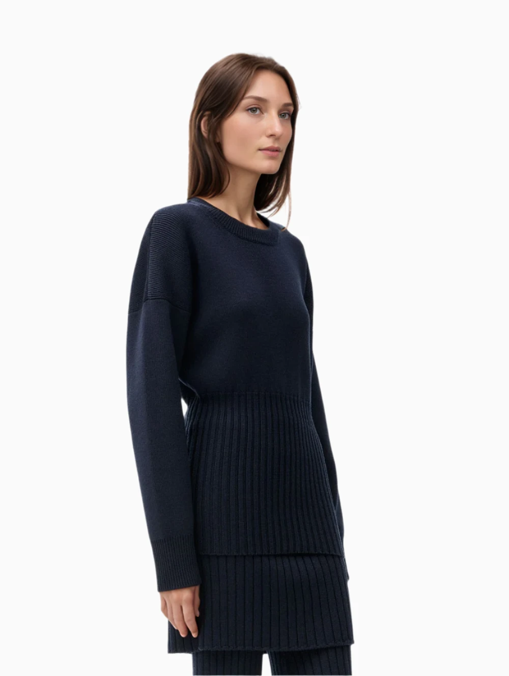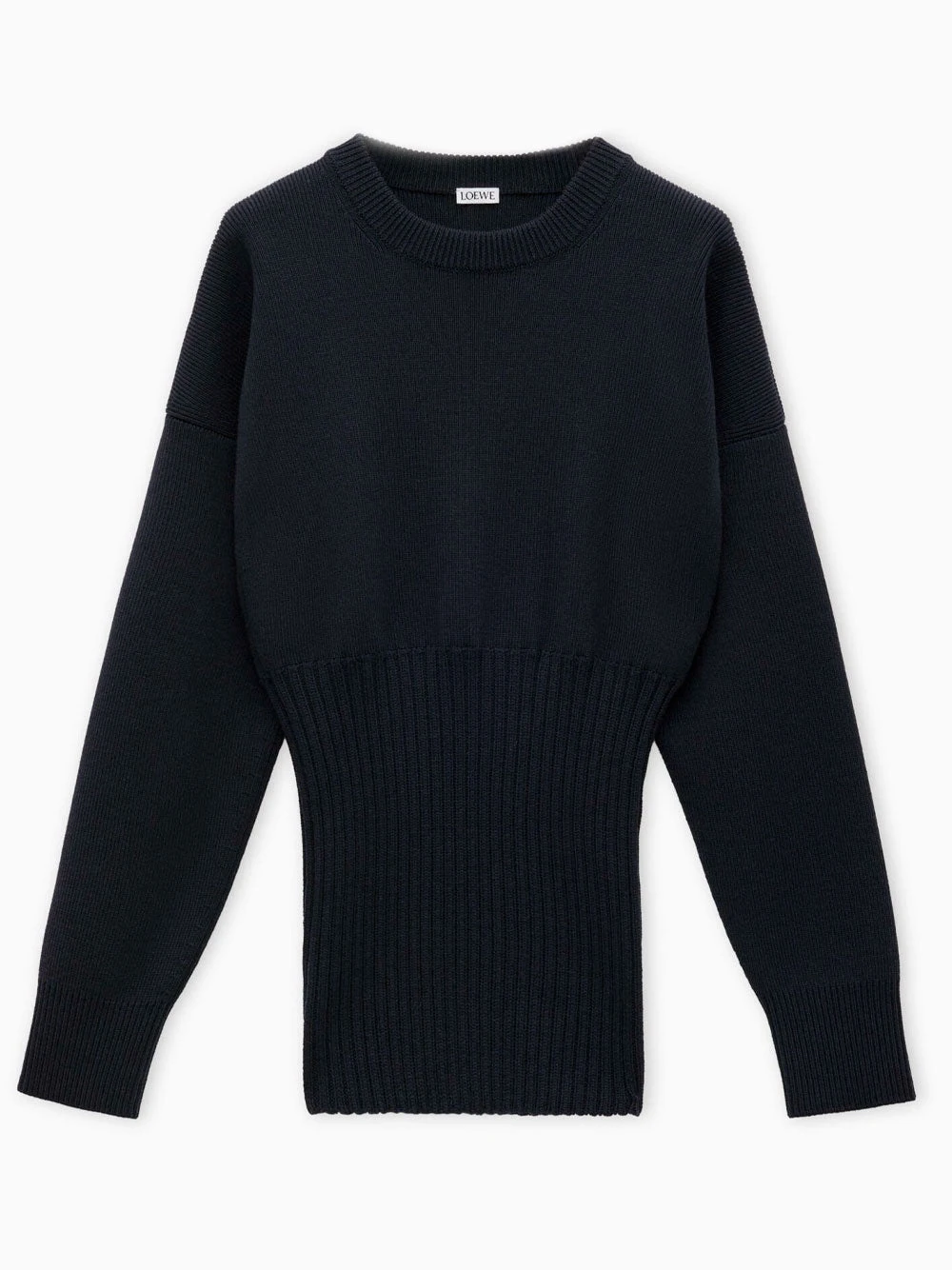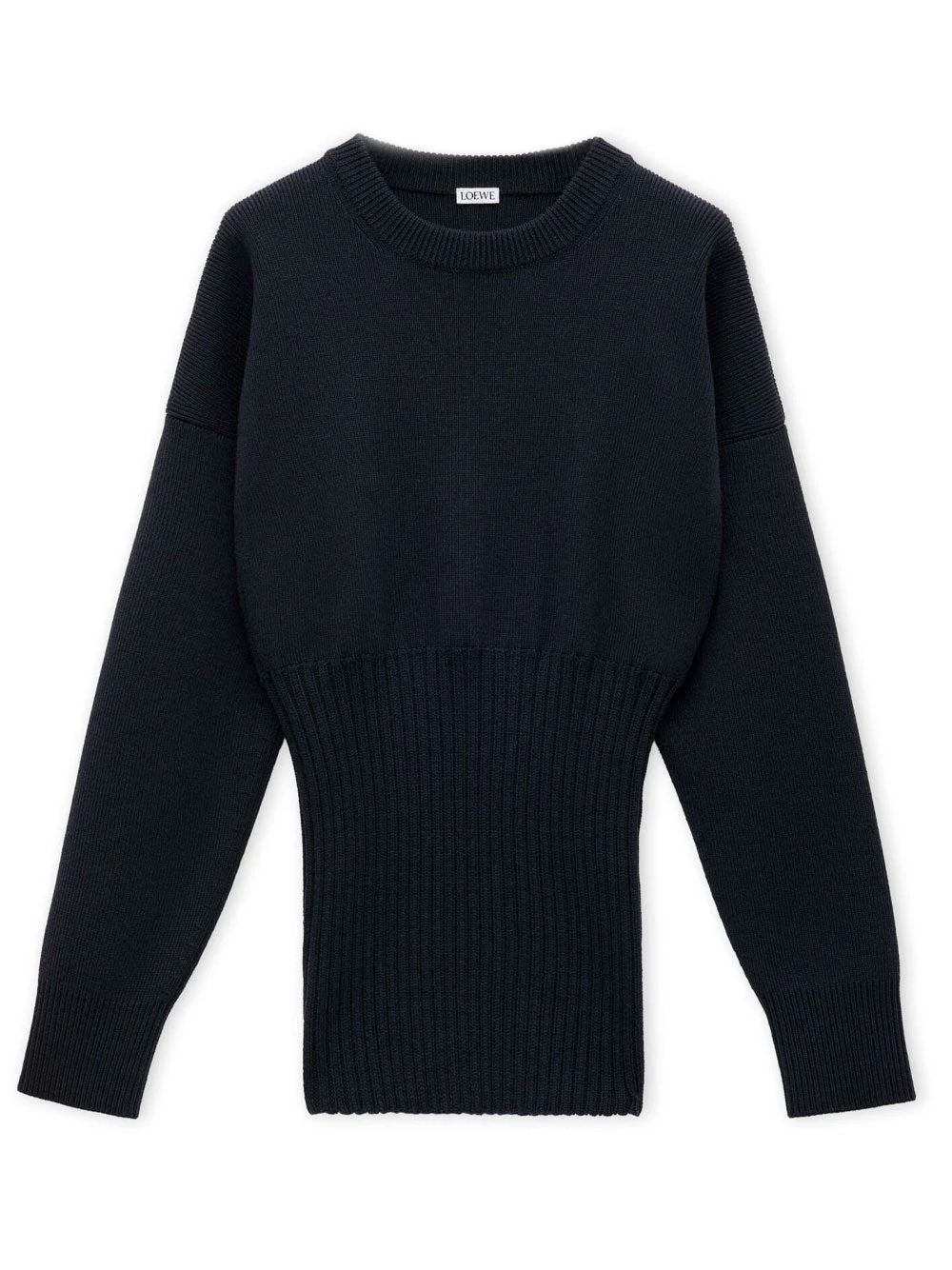 LOEWE sweater crafted in medium-weight wool. featuring mixed rib knit, slim fit, regular length, ribbed round neck, dropped shoulders, elongated sleeves with contrast ribbing at the cuffs, fitted rib bottom and Anagram embossed leather patch placed at the back.