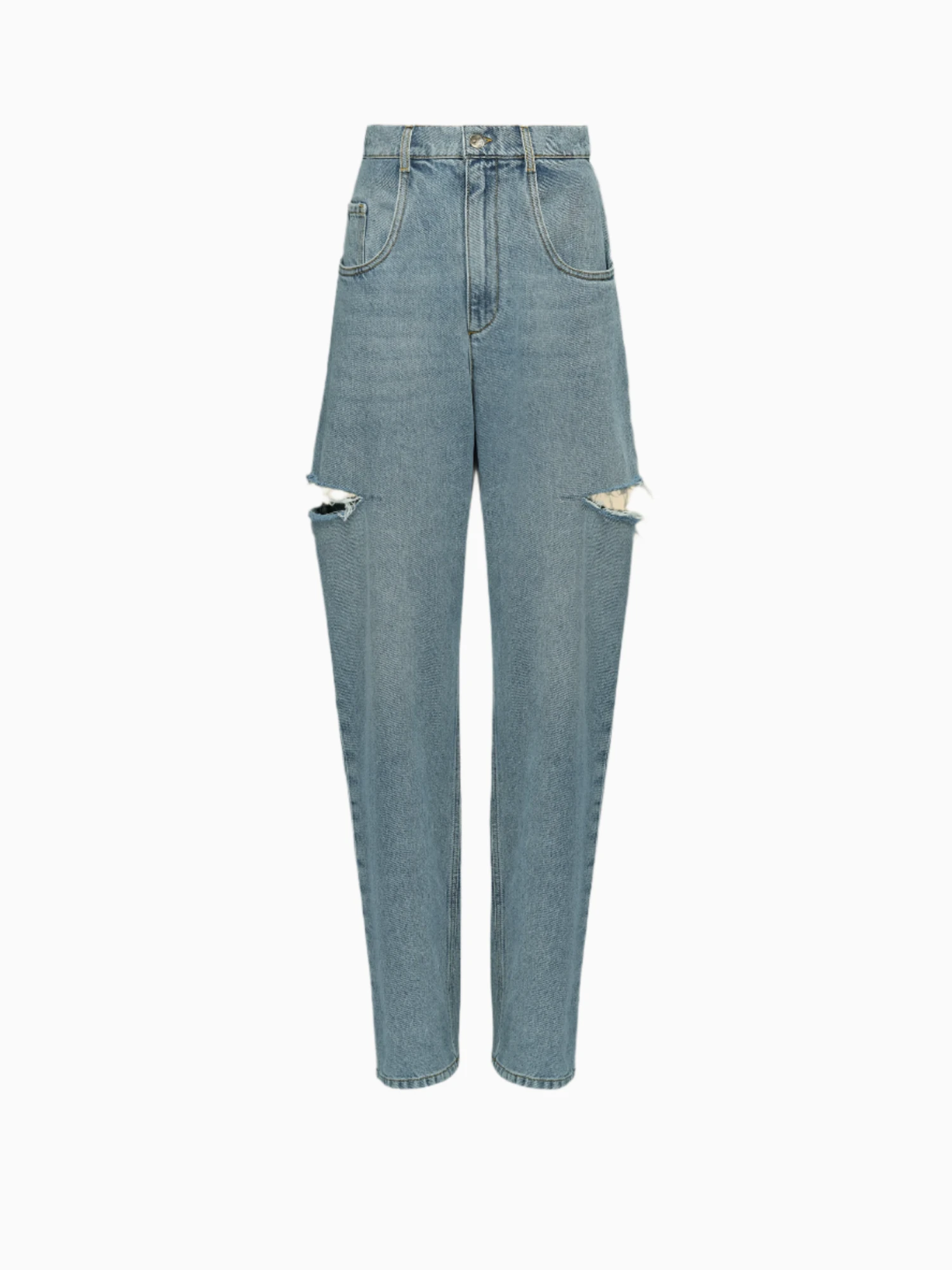 Maison Margiela jeans with slash details. Crafted in stonewashed blue cotton denim with a loose-fit, tight at the waist and voluminous on the straight legs. Boasting a rough-cut to reveal fraying fabric at the slashes on the thighs, five pockets and a contrast camel topstitch. Featuring a tapered leg, belt loops, zip closure and four stitches at the back.