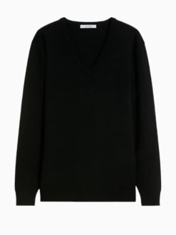 Max Mara black fine jumper. Crafted in fine pure wool yarn with a V-neck, slightly oversized construction and a stitched fabric. Featuring long sleeves, dropped shoulders and a ribbed trim.