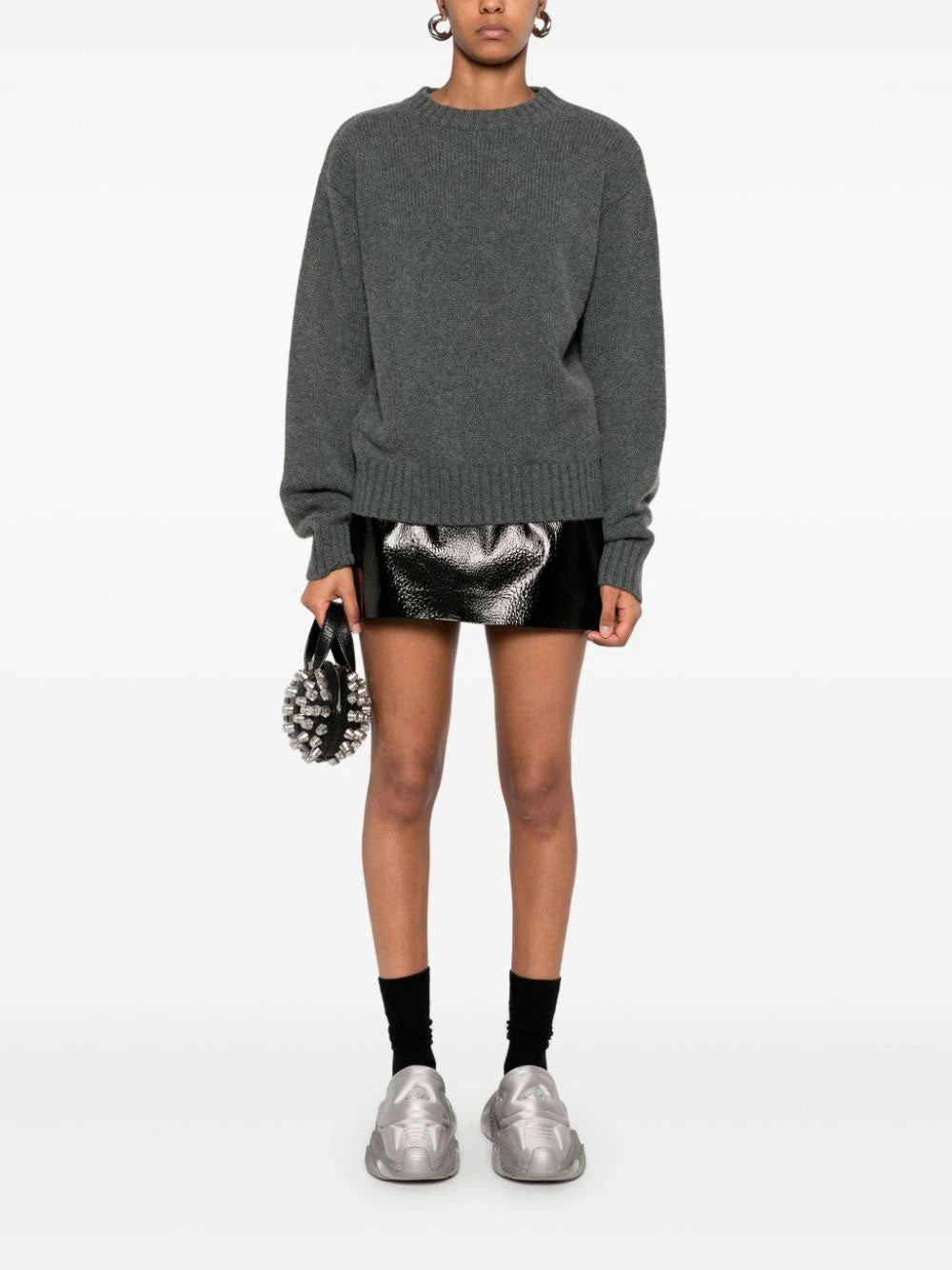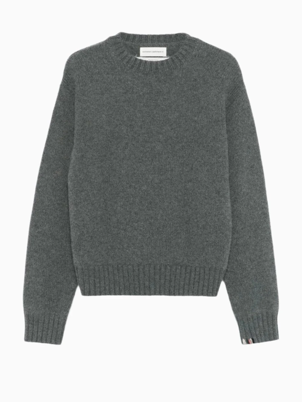 Extreme Cashmere medium grey cashmere sweater. Crafted in a knitted construction with a mélange effect, ribbed crew neck, dropped shoulder and ribbed cuffs and hem.
