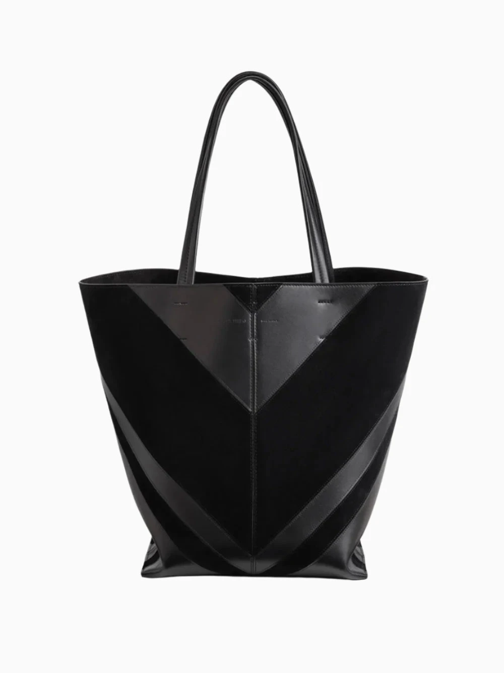 Phoebe Philo Pot cabas bag. Crafted in black leather and suede intarsia stripes with a camel suede lining and a softly structured silhouette. Featuring a detachable interior zipped pouch, tonal leather handles and clip fastening.
