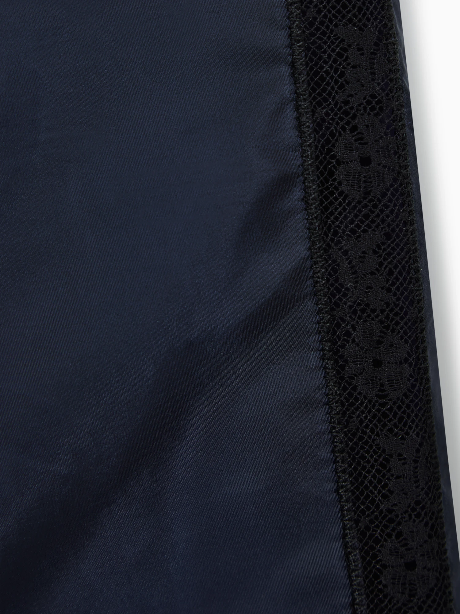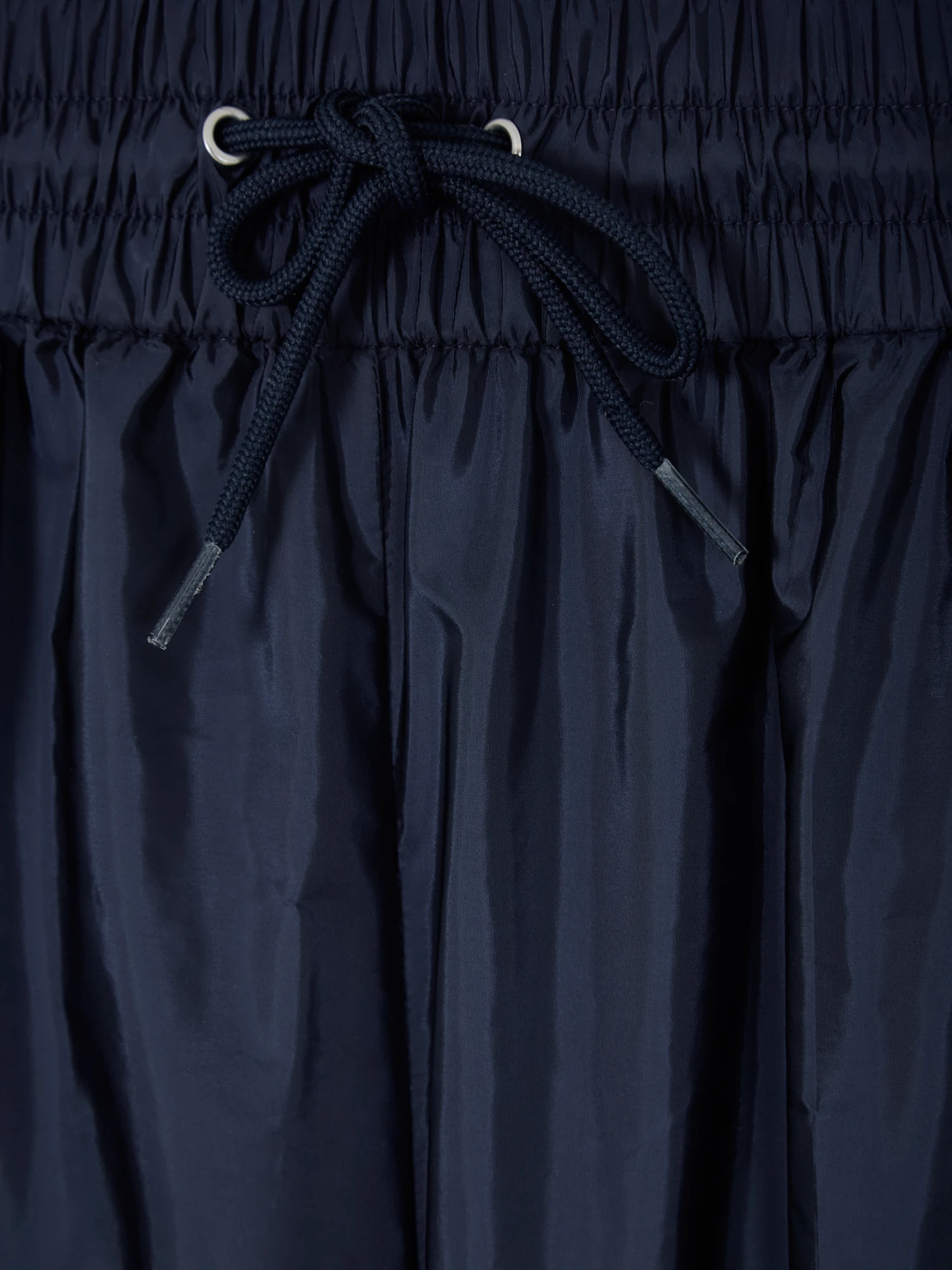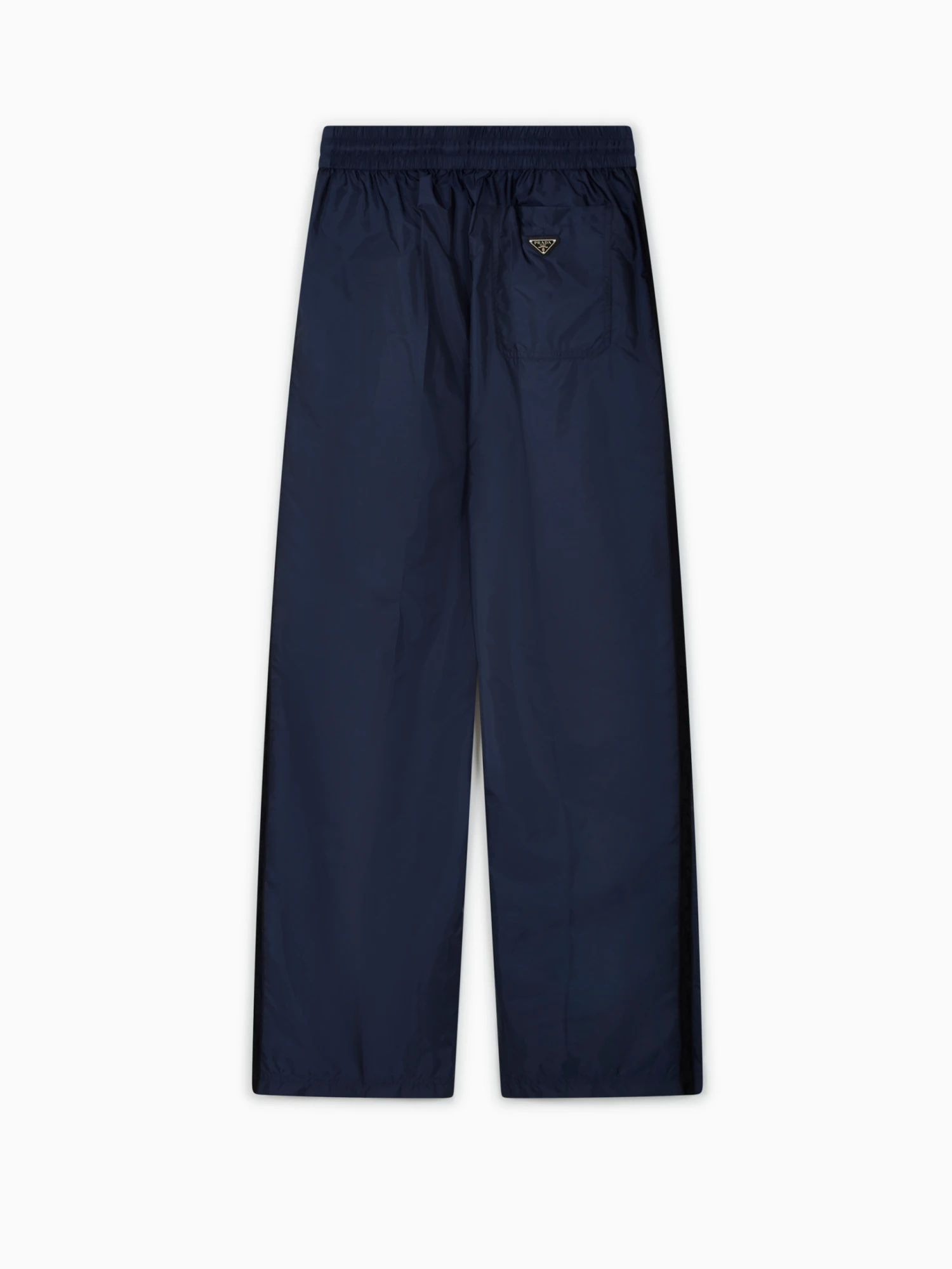 Prada Re-Nylon pants. Crafted in navy blue lightweight re-nylon with coulis at the waist, pressed pleat detailing and triangle logo on the back.