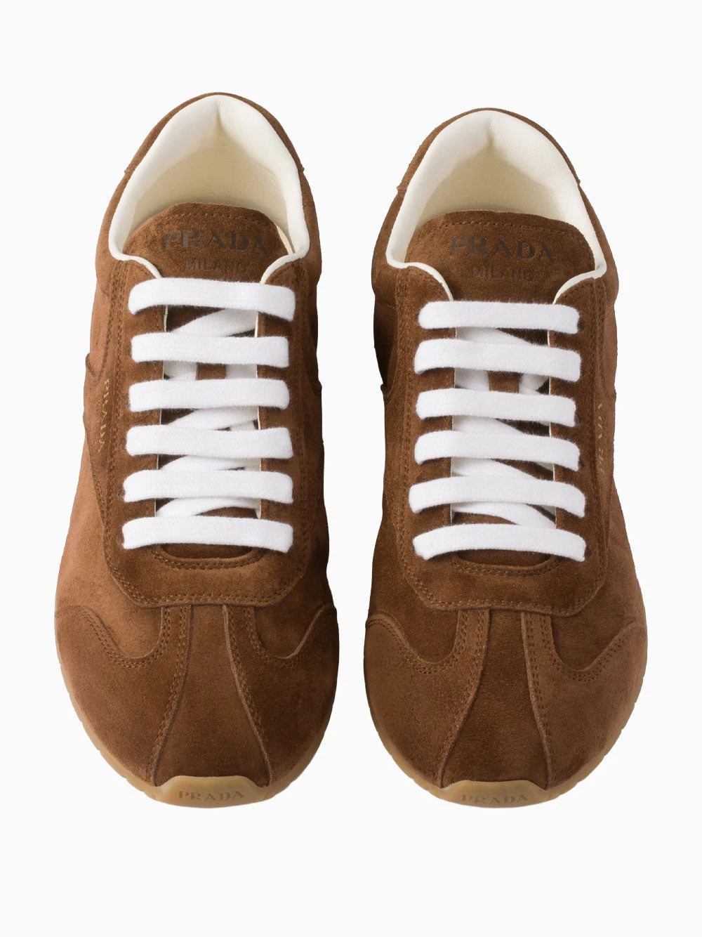 These suede sneakers from Prada feature a soft, lightweight design with an elegant and essential sporty style. The silhouette, defined by tapered lines and a thin sole, harmonizes function, comfort, and contemporary style. It features leather appliqués on the upper, perforated leather lining, a screen-printed Prada Milano logo, cotton laces, and a removable leather-lined insole.