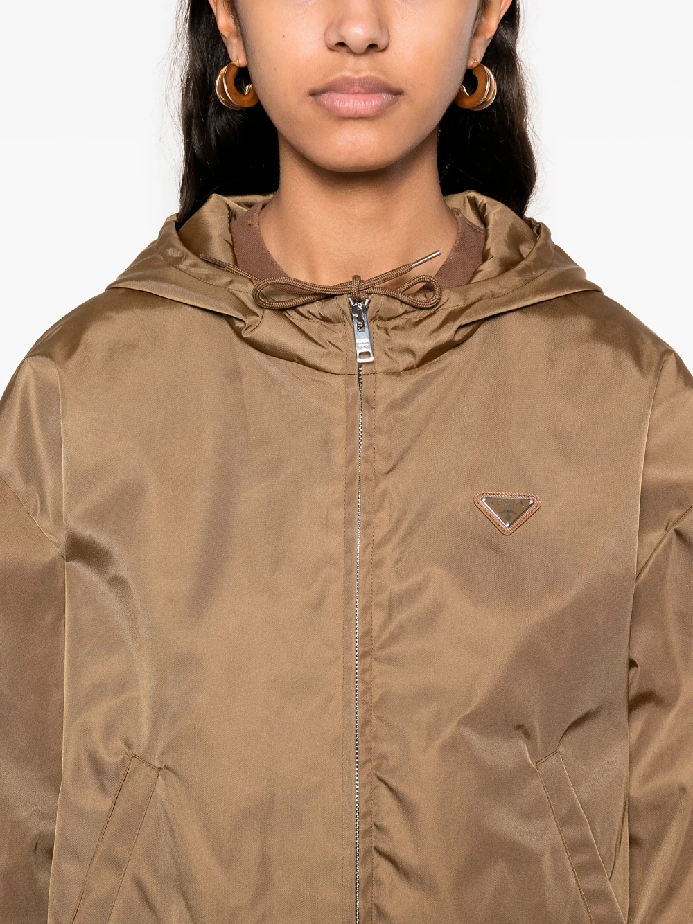 Prada triangle-logo jacket featuring olive green, front two-way zip fastening, slouchy drawstring hood, press-stud fastening cuffs and two side welt pockets.