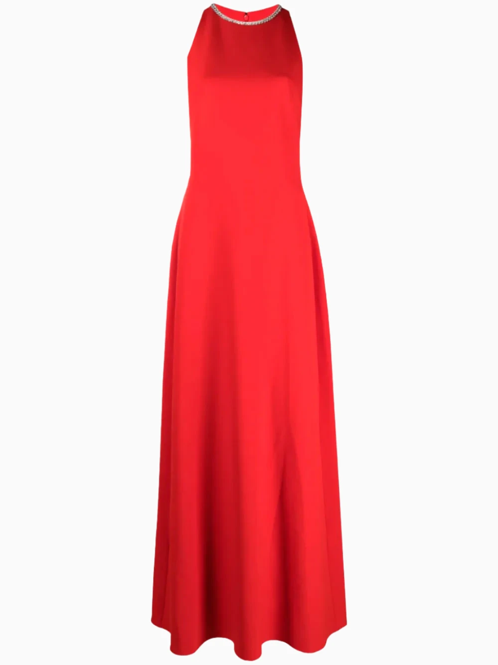 Safiyaa red long dress with crystal detailing at the neckline. This sleeveless design features crew neck, rear zip fastening and fitted waistline that falls into a flared skirt.