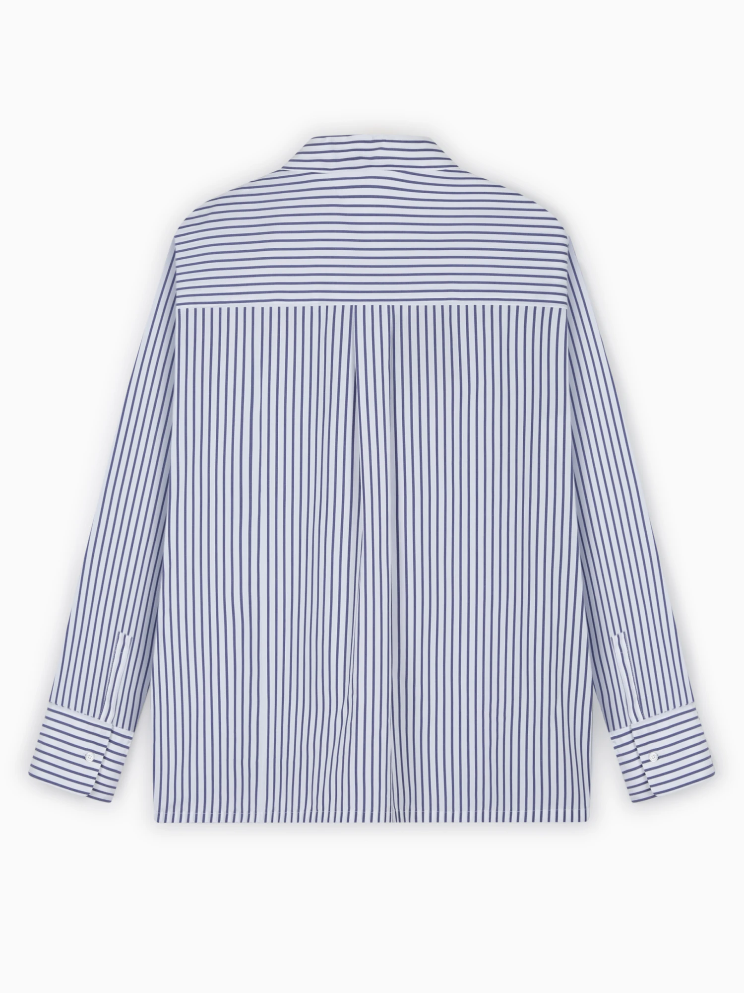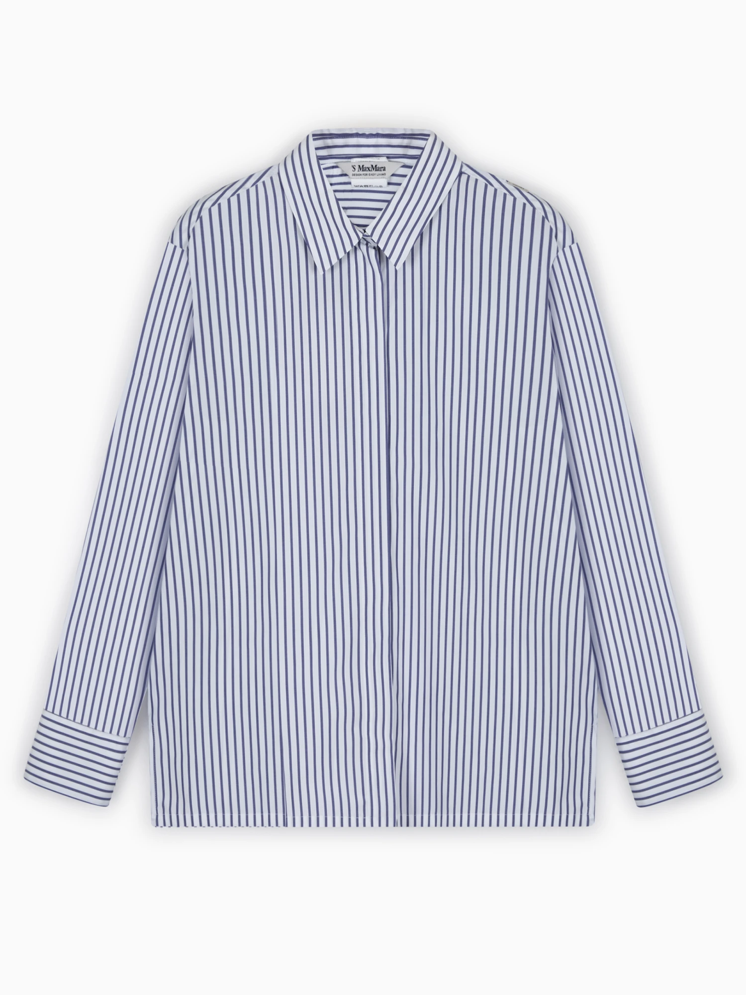 ‘S Max Mara Tata shirt. Crafted in white and blue striped organic cotton with a washed texture and a classic collar. Featuring long sleeves, cuffs, a small slit on the side hem and pleated yoke.
