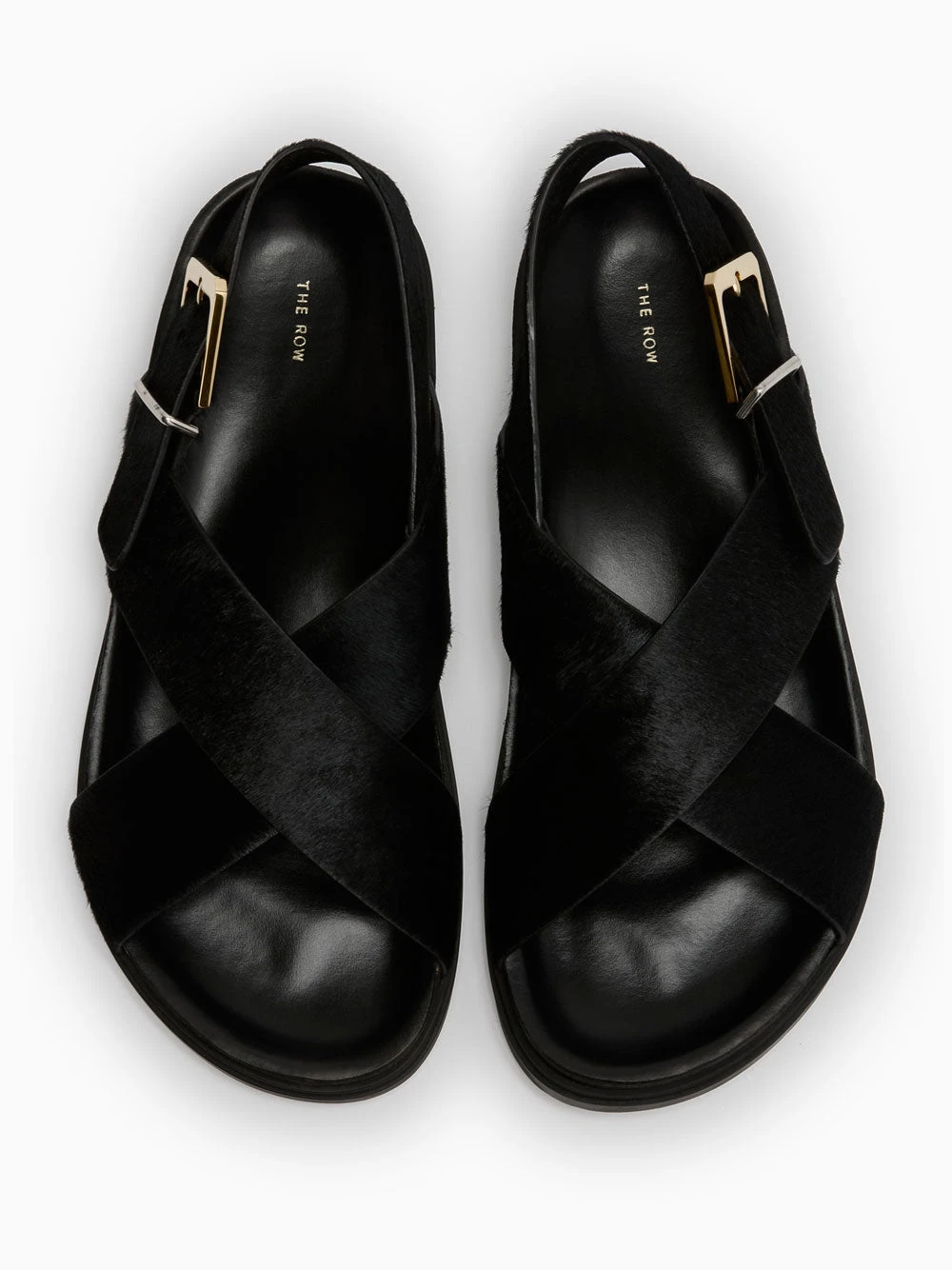 The Row Buckle sandals. Crafted in black leather with a round toe and a rubber sole. Featuring fur straps, slingback design and buckle fastening.