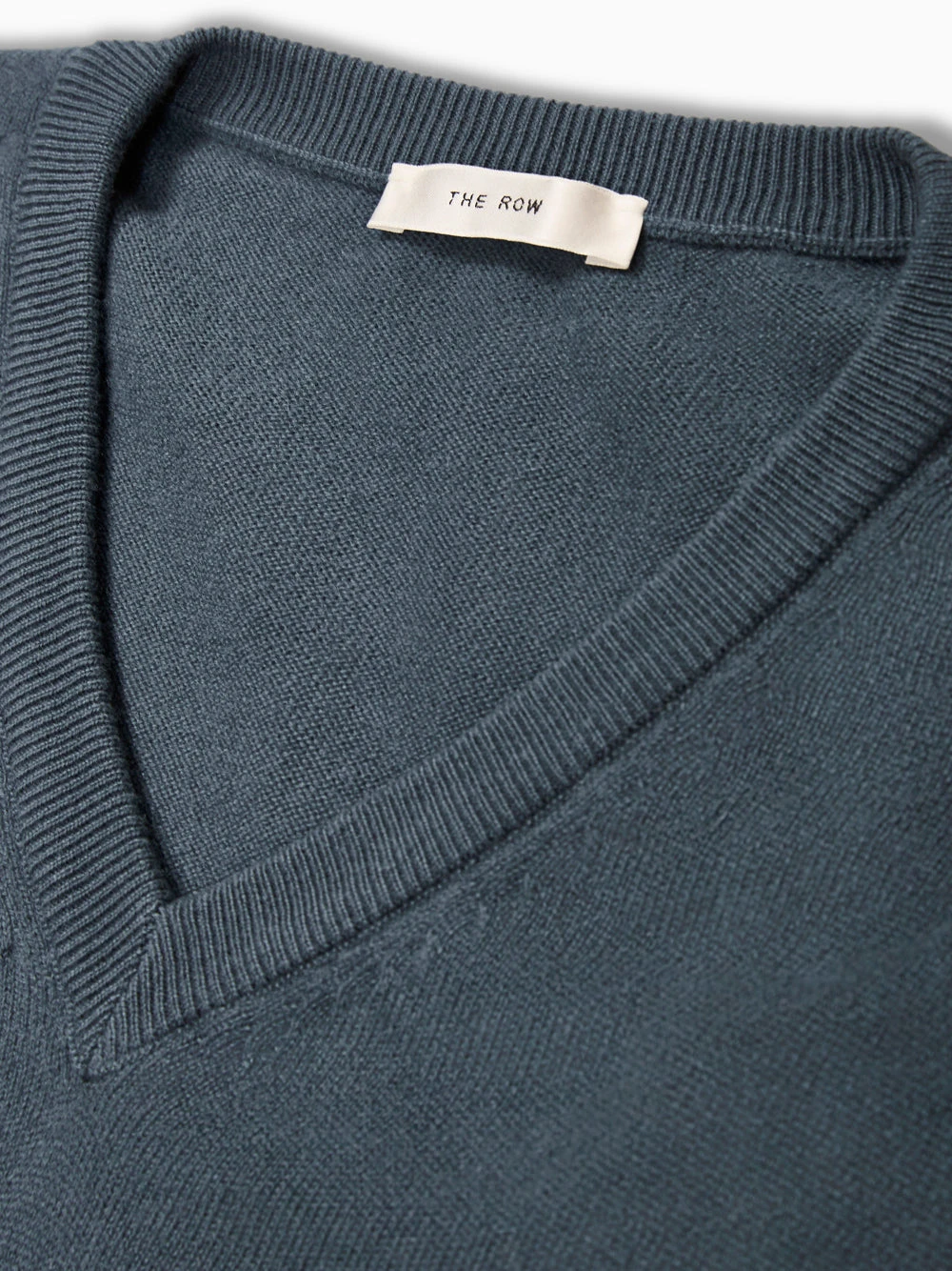 The Row cashmere jumper in cerulean blue. V-neck and long sleeves. Elasticated cuffs and hem.