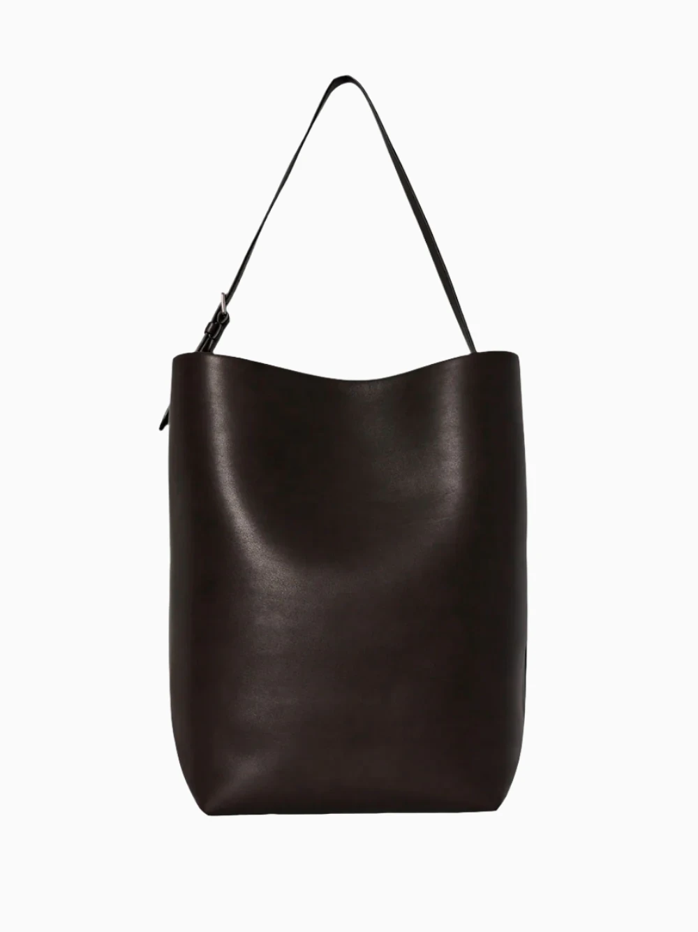 The Row dark brown leather shoulder bag. Classic tote bag crafted in polished saddle leather with an interior tie closure and an adjustable flat handle.