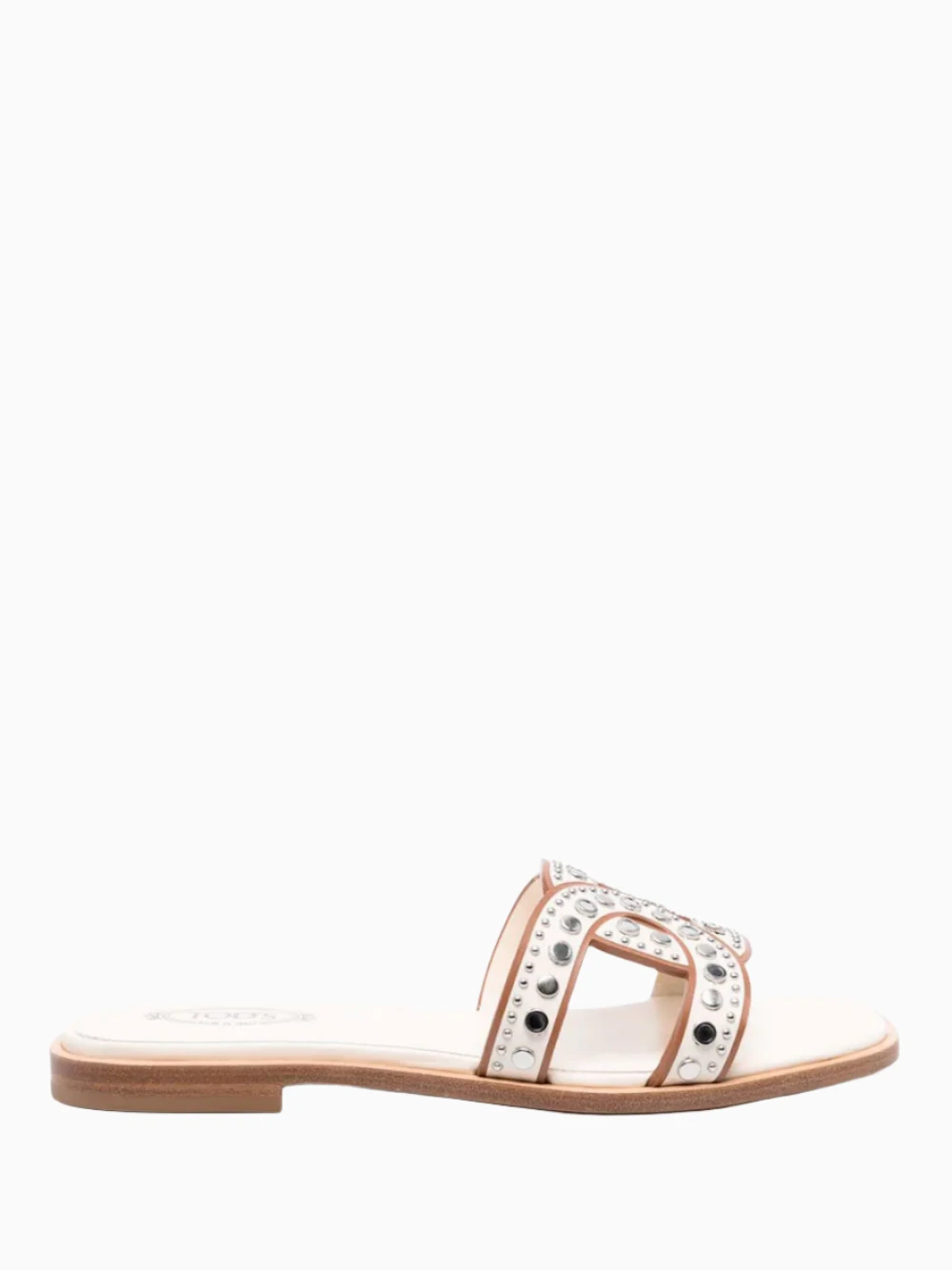 Tod´s Studded sandals, crafted in cream white/camel brown leather. Featuring silver-tone hardware, slip-on style, square open toe and logo-shaped toe strap. Branded footbed, low stacked heel and leather outsole.