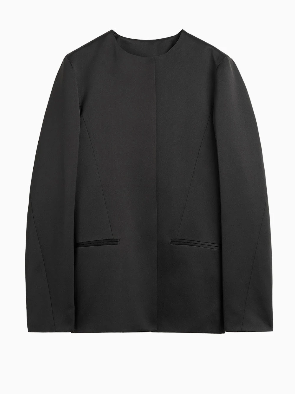 Toteme satin jacket. Crafted in black satin with no lapels and a crew neck.