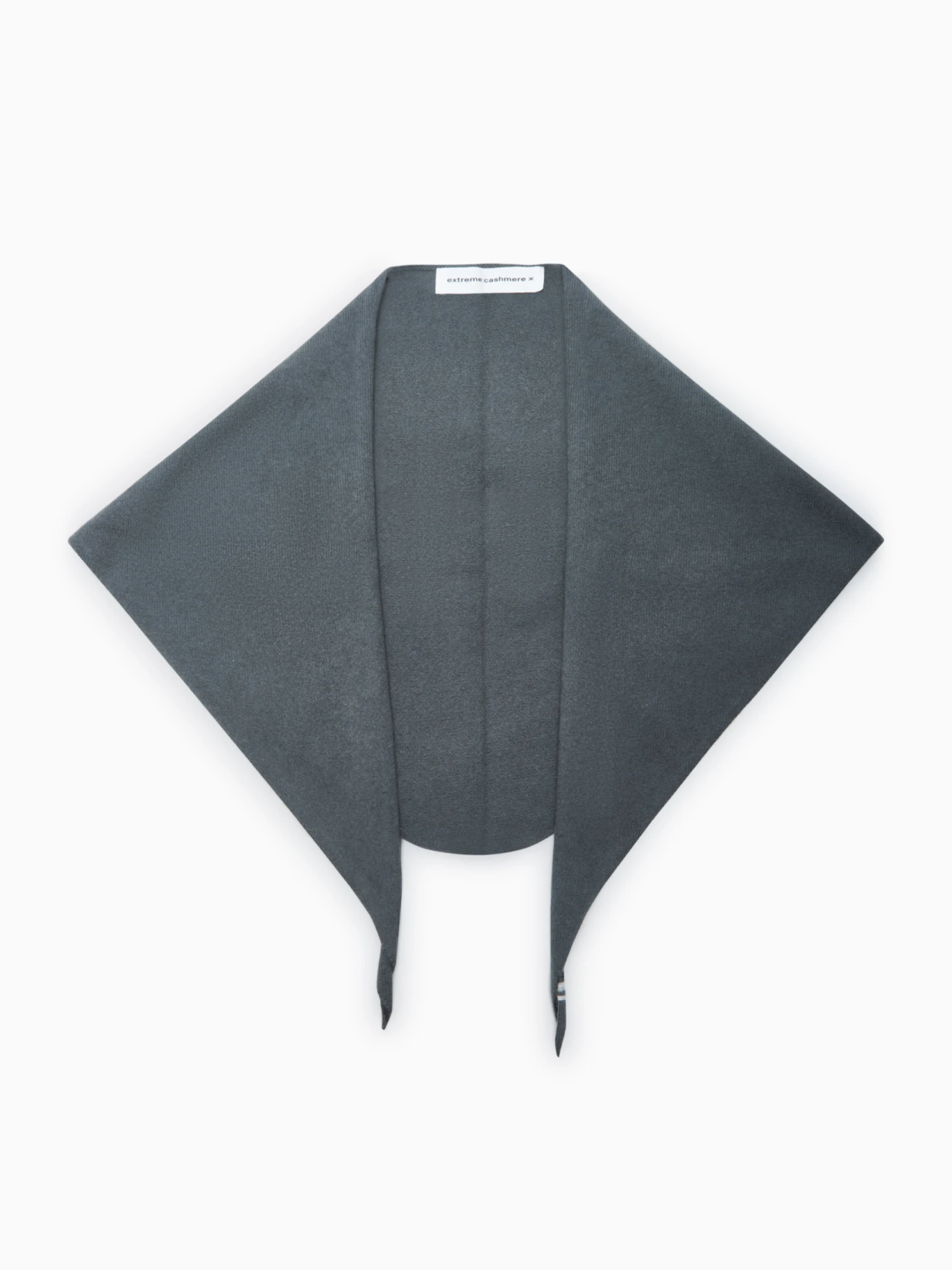 Extreme Cashmere triangular scarf. Crafted in grey stretch cashmere with unfinished edges and brand logo stitching on one edge. Can be worn as a scarf, belt or logo.