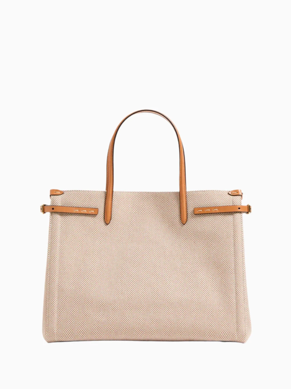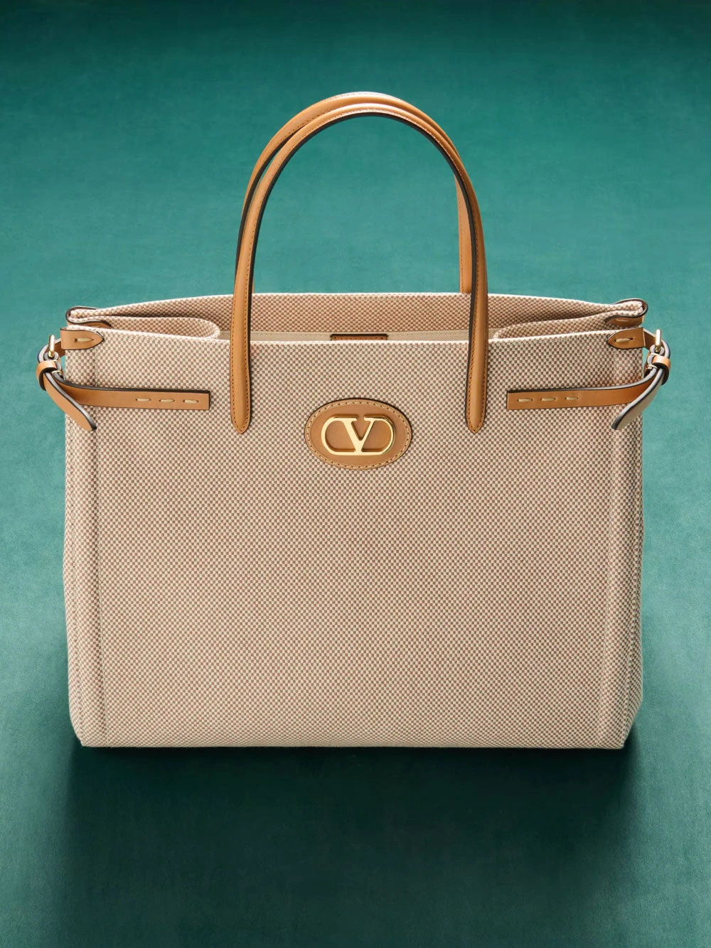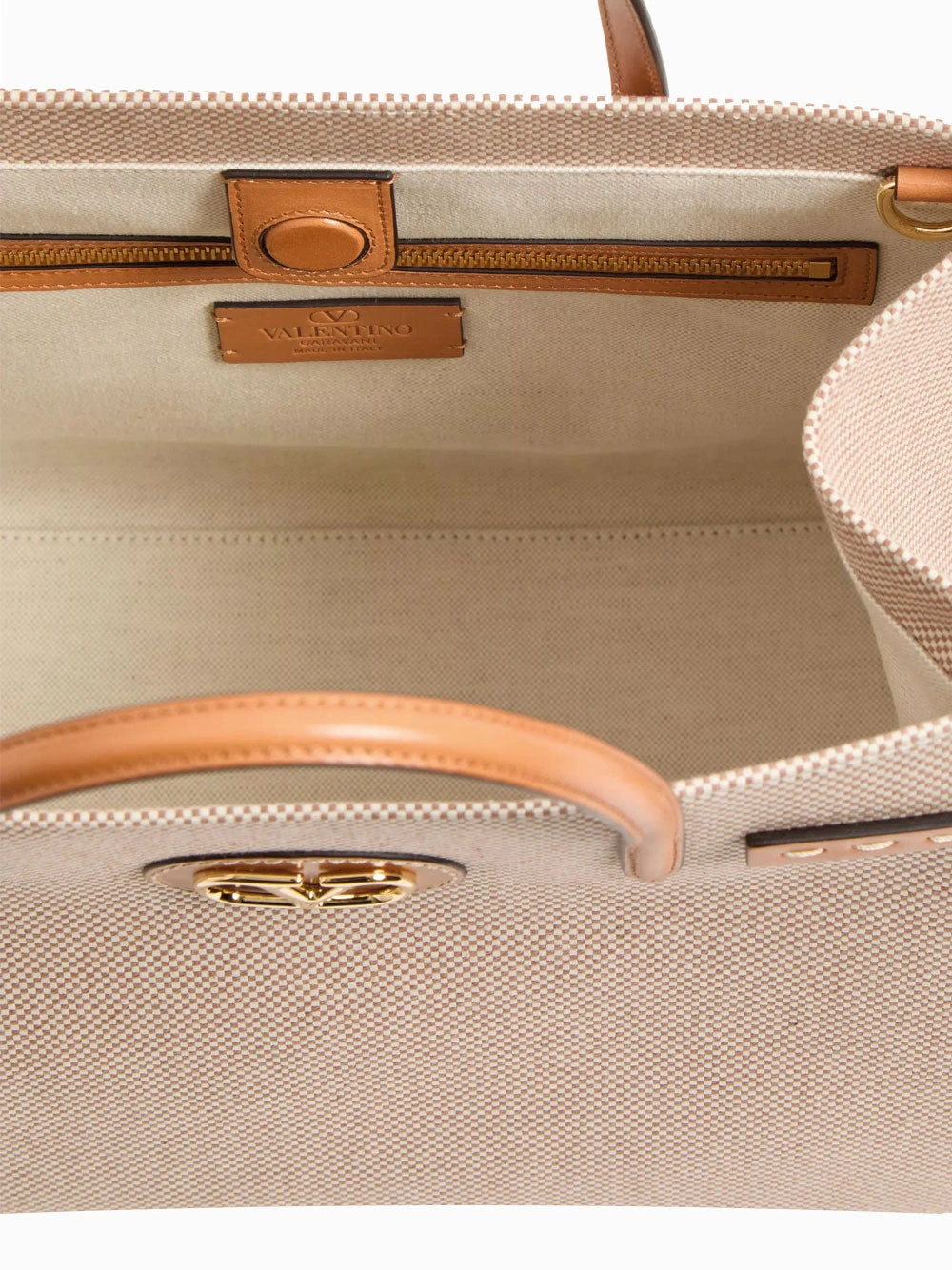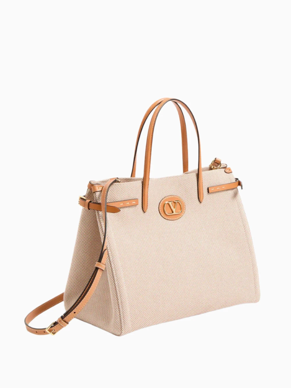 Valentino Garavani medium Antibes bag in beige and caramel. Crafted in canvas with adjustable side buckles and leather patches with metal VLogo Signature. Gold-tone hardware, magnetic closure and canvas lining.