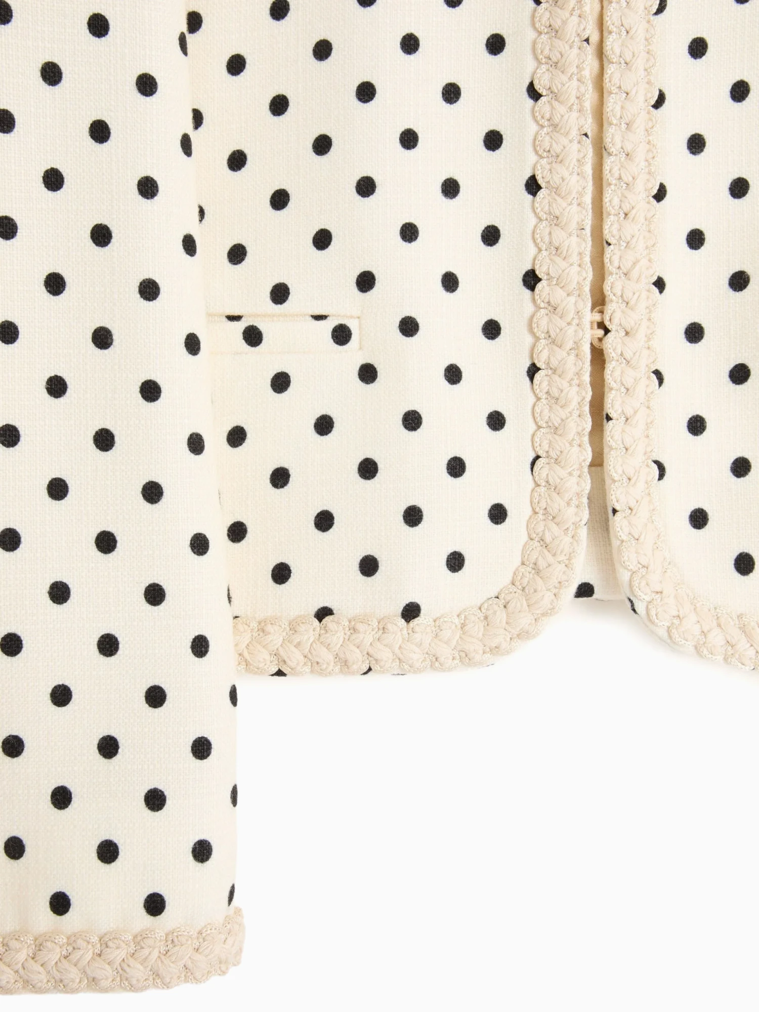 Valentino Garavani polka-dot jacket crafted in beige. Featuring front hook and eye fastening, long sleeves and two side slit pockets.