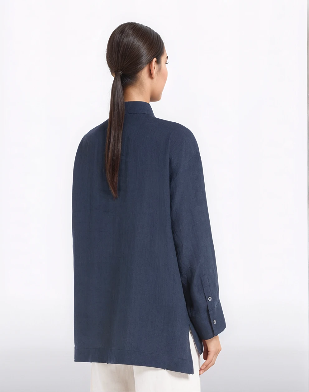 ‘S Max Mara navy long-sleeved shirt in washed pure linen canvas. The garment features a polo-style collar, dropped shoulders and shirt cuffs with buttons. Asymmetrical hem, slightly longer at the back, with side slits. Small front closure with concealed buttons.